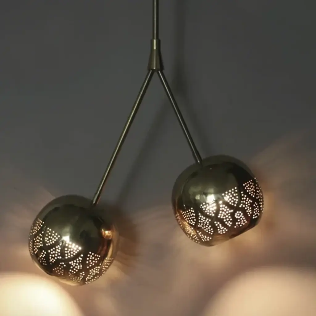 A statement of modern design and a love letter to Morocco. Handmade in Marrakesh, the Nur Double Light Pendant from Dounia Home delights in its asymmetrical design from afar and captivates in its traditionally crafted pattern up close. Morocco-based Dounia Home comes at each design with a mission to showcase its country's traditional art forms while pushing the boundaries of modern design. They take great inspiration from ancient architecture, a feature highlighted in the shade's pattern. Wrapping around a globe shade made in recycled metal, a hand-punctured application of holes suggests a traditional trellis pattern. Artisans define the pattern more with an etched line made using a chisel and square hammer. These intricate globes join with connecting stems that give them a sculptural silhouette. A flip of the switch produces a magical experience as light beams up the intricate pattern and casts outwards in a texture, ambient design. The light also shines down for a table glazing glow.