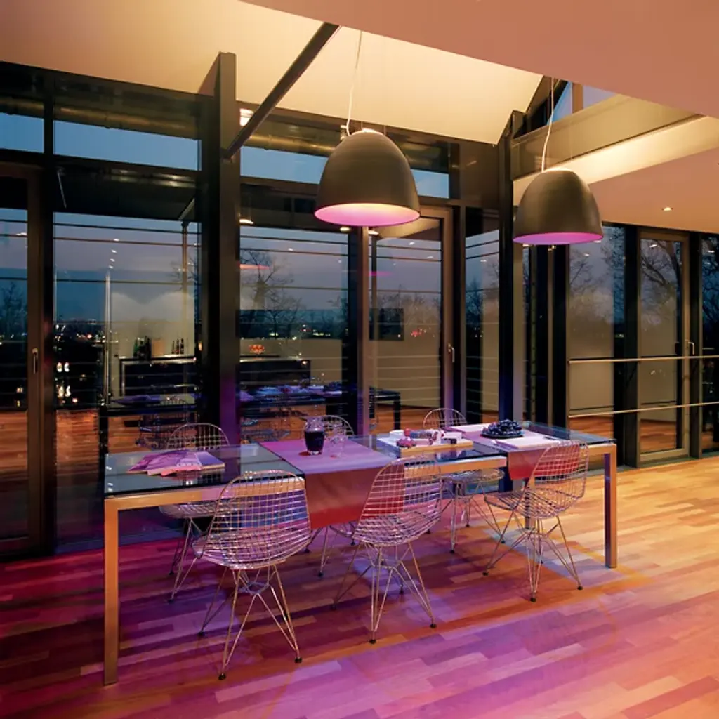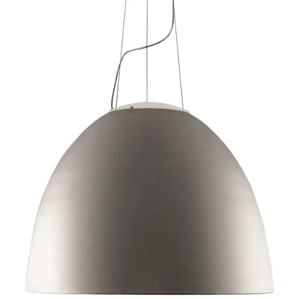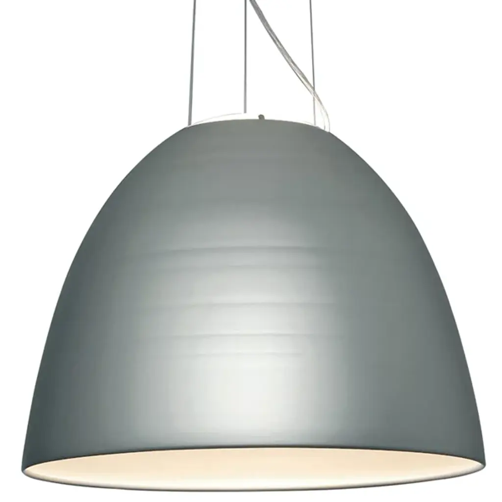 The Artemide Nur LED Pendant adapts a classic design with the latest LED technology, filtering a large amount of illumination from a broad dome shade with astonishing results. A polycarbonate bottom diffuser softens the magnitude of light flooding from the shade, creating a comforting atmosphere even when viewed directly. The spun aluminum is left with subtle grooves on the surface, and a clear glass diffuser is left at the apex of the structure which sends a gentle halo of light to the ceiling.