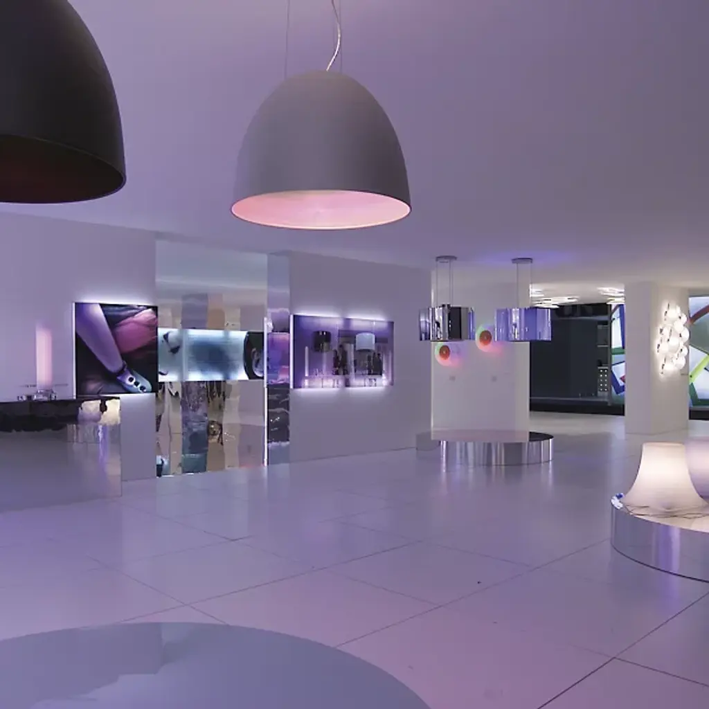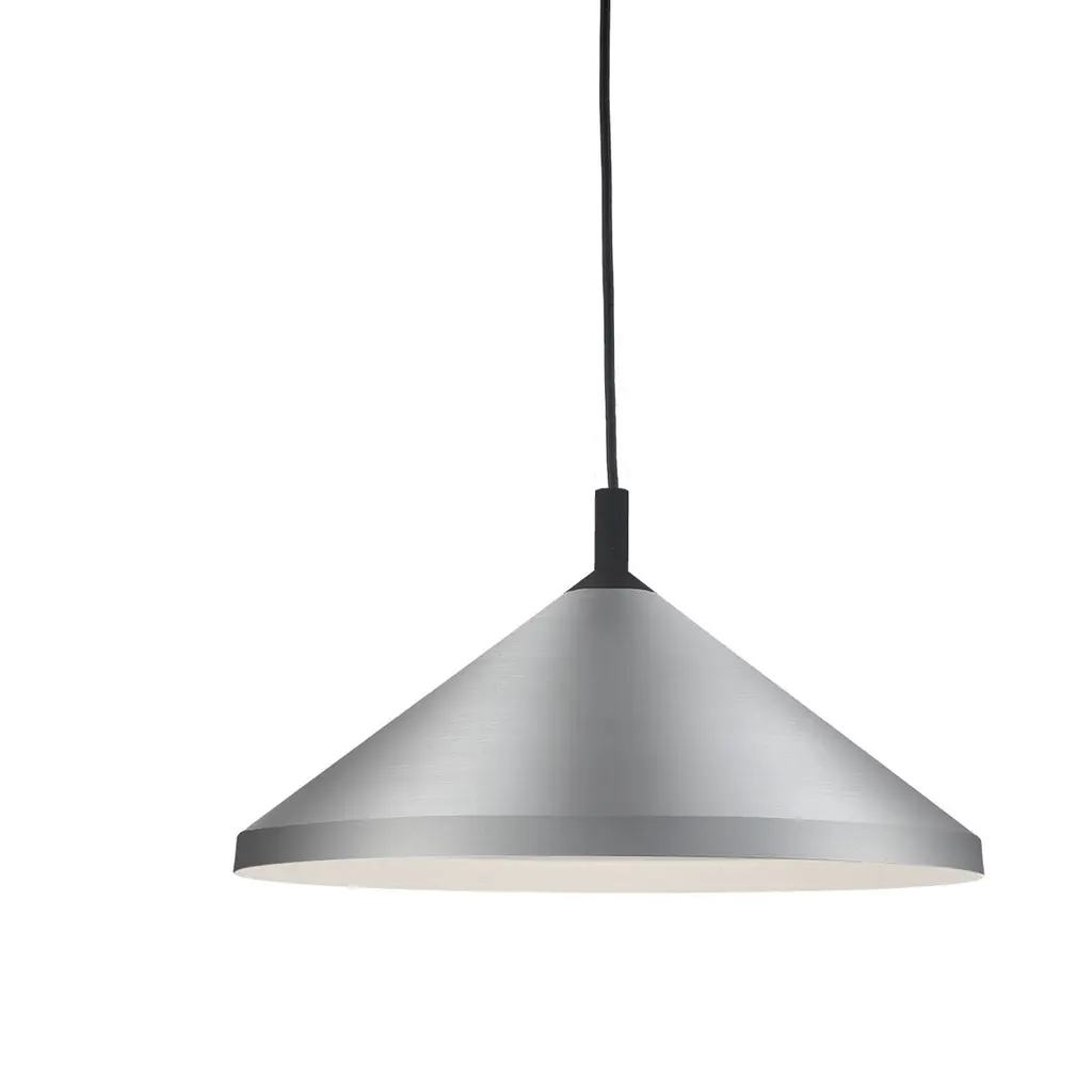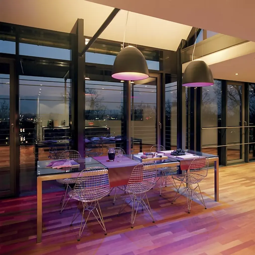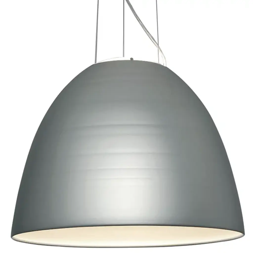 The Artemide Nur Pendant provides a large amount of light for modern spaces both commercial and domestic. Its aluminum spun dome shape directs the light downward for greater functionality while the sanded glass at the top offers a more subtle up light. Create an eye-catching look by choosing the optional red or blue color filters, or opt for a simpler look with the anti-glare filter.