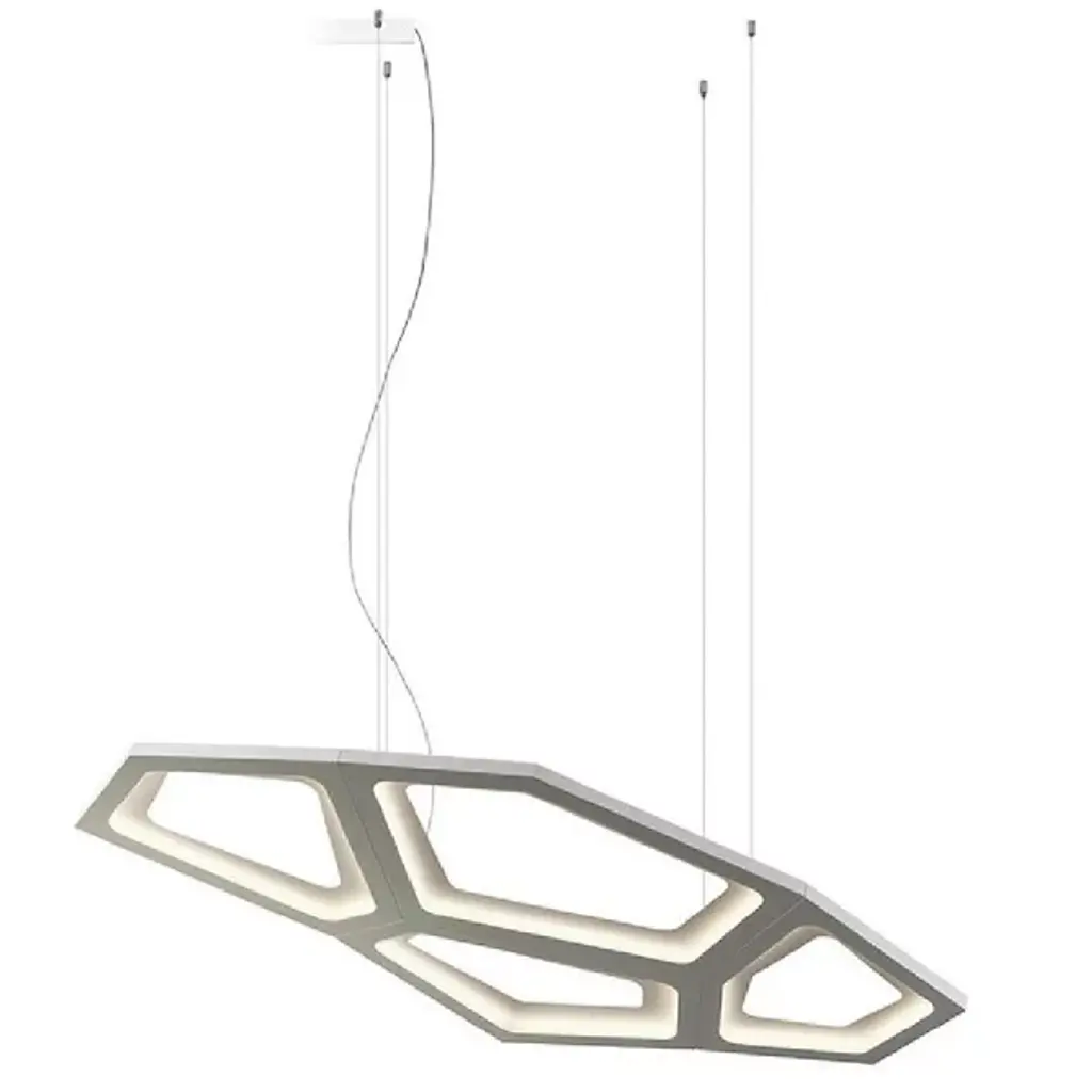 The Nura LED Pendant from Carpyen highlights floating plane geometry to create a captivating visual allure. Designed by Toni Clariana, its intricate modern design features an open metal shade casting a subdivided, geometric halo of energy-efficient light. Suspended by slim cables connected to a circular canopy and small sub-anchors, the pendant expresses a graceful and weightless presence. The innovative design blends sophisticated design with contemporary aesthetics, creating a striking addition to any space.