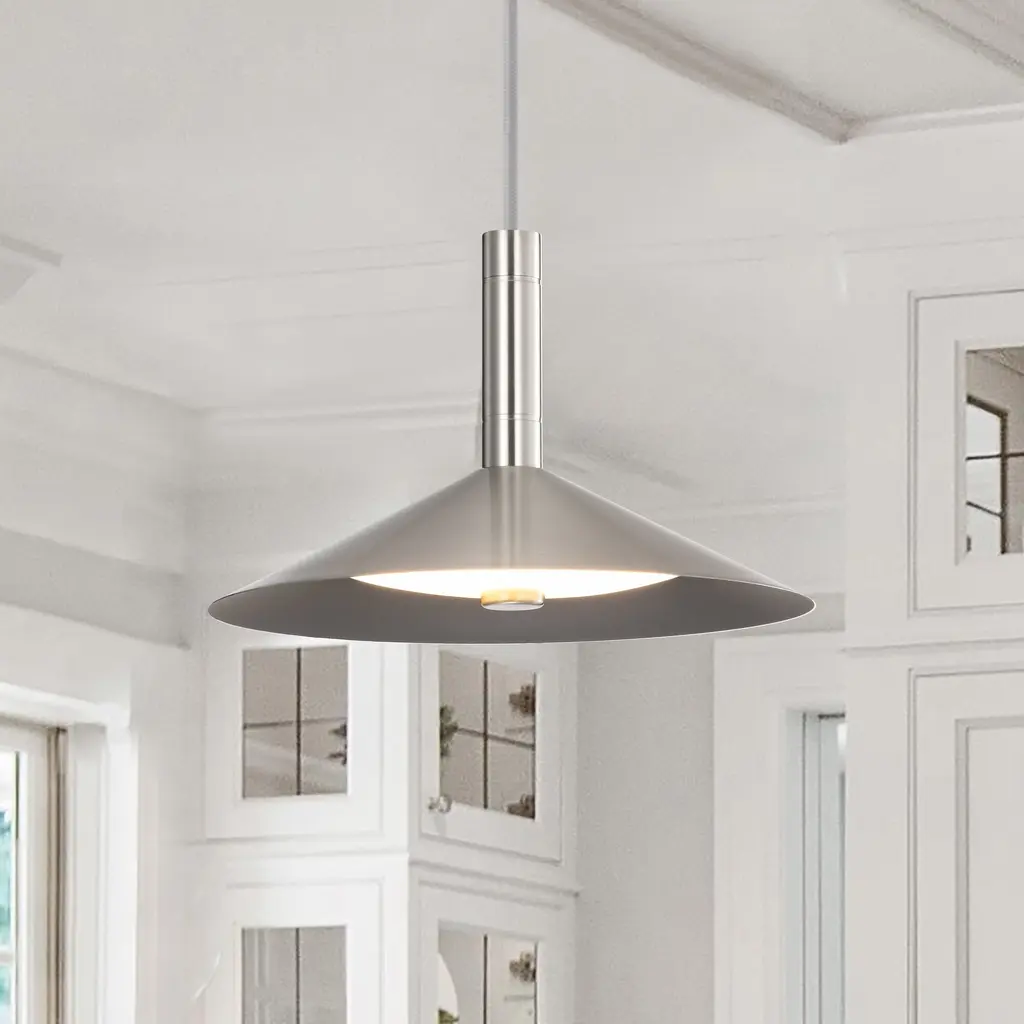 The Corrine 62-2071 LED pendant effortlessly marries style and substance, making it the epitome of understated modern design. Designed to captivate, the integrated LED features three CCT selectable options from warm white to natural light, softly diffusing the light with an acrylic diffuser and a reflector lining the steel shade. Finished with a contrasting braided rayon cord cove, continuing the polished aesthetic, sleek lines and minimalist silhouette making it a versatile addition to any space. Seamlessly blending into various interior styles, Corrine adorns your home as a statement piece that complements your discerning taste.Features:Dimensions:Electrical Specifications: