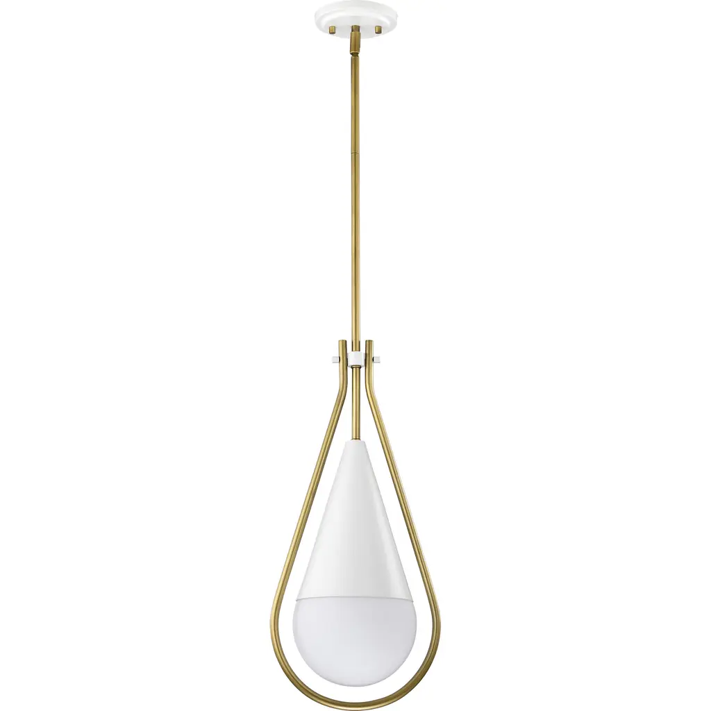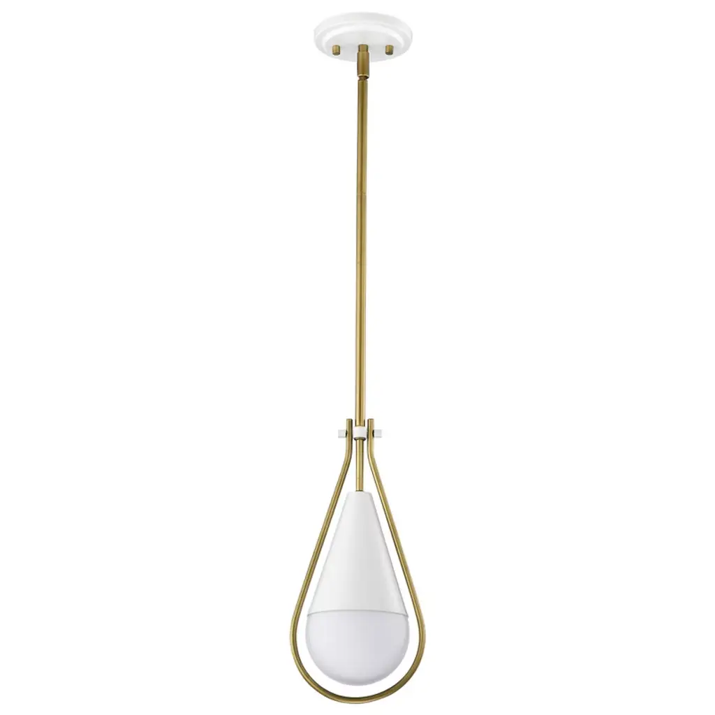 Collection: Admiral, Material: Steel, Finish Color: Matte White/Natural Brass, Width: 10", Height: 21.5", Length: 10", Lamping Type: Incandescent, Number Of Bulbs: 1, Wattage: 60 Watts, Dimmable: Yes, Moisture Rating: Damp Rated, Desc: A modern collection with a twist, the Admiral 60-7903 medium pendant features a dual finish, unique design, and a fashionable statement for home luminaires. A suspended tear-dropped shape is comprised of matte black with natural brass elements encompassing the fixture. The white opal glass orb shields the light source for smooth, even lighting to bring a warm glow to any space. A beautiful design that is versatile and will compliment a variety of home decors. Accepts one 60 watt A19 medium base bulb or LED equivalent / Steel Construction / White Opal Glass / Matte Black Finish / Damp Location Rated / 1 Year Warranty / Instructions and mounting hardware included for easy installation / Experience the perfect blend of style and functionality with the Ad