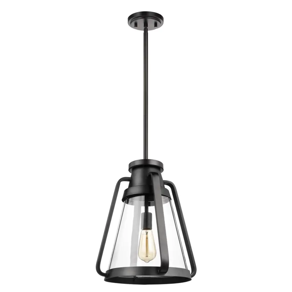 Collection: Everett, Material: Steel, Finish Color: Matte Black, Width: 10", Height: 11.88", Depth: 10", Lamping Type: Incandescent, Number Of Bulbs: 1, Wattage: 60 Watts, Dimmable: No, Moisture Rating: Dry Rated, Desc: Glass and overlaying metal create a nice depth with the Everett 60-7552 small pendant. The clear, tapered glass provides 360-degree illumination. When paired with a vintage bulb, it creates a maritime-vintage style. A matte black finish on the fixture body, rods and swivel canopy results in a style suited to many applications of your choosing. Uses one 60-watt incandescent medium base bulb Fixture measures 10 inch diameter x 11.88 inch height Rated for indoor use in dry locations Finished in matte black with clear glass Mounting hardware and installation instructions included Limited one year fixture warranty. Canopy Included: Yes / Canopy Diameter: 5.00 / Rod Length(s): 36.00 / Shade Included: Yes / Shade Dimensions: 7.95 x 8.17. ,