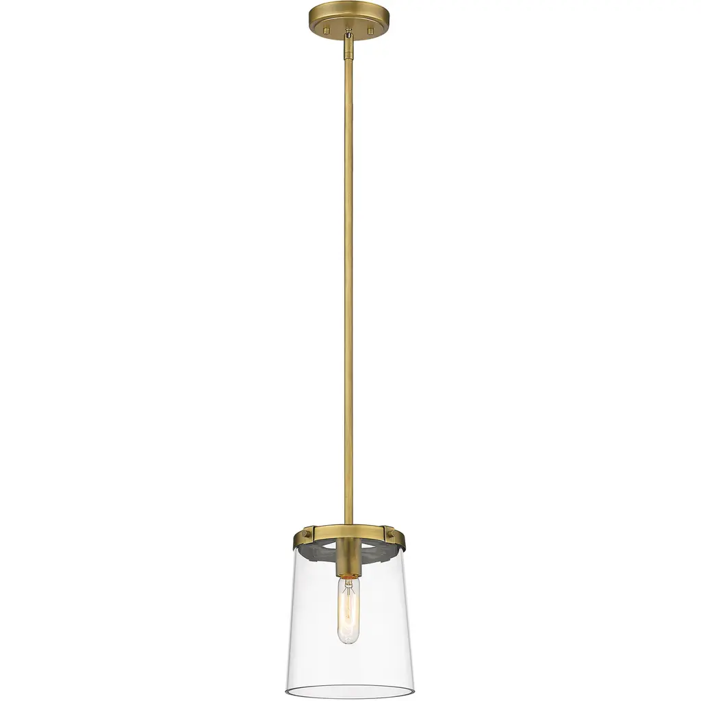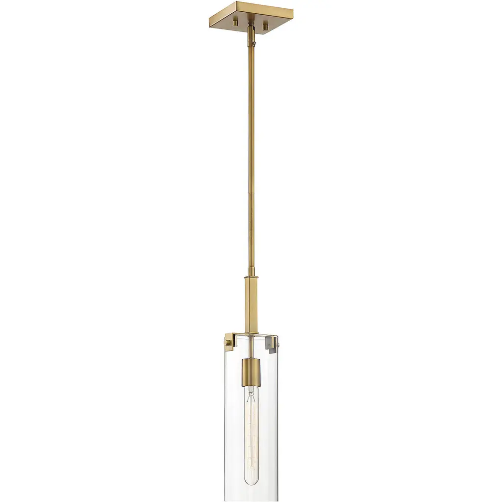 Collection: Intersection, Material: Steel, Finish Color: Burnished Brass, Width: 3.5", Height: 8.5", Depth: 3.5", Lamping Type: Incandescent, Number Of Bulbs: 1, Wattage: 60 Watts, Dimmable: No, Moisture Rating: Dry Rated, Desc: The blend of styles (modern, industrial and chic) is incorporated beautifully into the design of the Intersection 60-7529 mini pendant. The cylindrical clear glass shades showcase a vintage filament bulb for a touch of nostalgia. The luster of the rich, burnished brass will pair superbly with existing finishes. Apply to a kitchen island or above a sink, or install several of the mini pendants in a dining area: a great design for any room. Uses one 60-watt incandescent medium base bulb Fixture measures 3.5 inch diameter x 8.5 inch height Rated for indoor use in dry locations Finished in burnished brass with clear glass Adjustable height to suit your needs Limited one year fixture warranty. Canopy Included: Yes / Canopy Diameter: 4.75 / Rod Length(s): 36