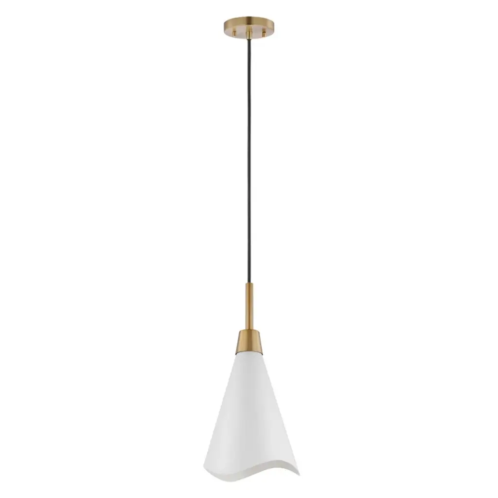 Collection: Tango, Material: Steel, Finish Color: Matte White/Burnished Brass, Width: 7.88", Height: 16", Depth: 7.88", Lamping Type: Incandescent, Number Of Bulbs: 1, Wattage: 60 Watts, Dimmable: No, Moisture Rating: Dry Rated, Desc: The Tango 60-7470 small pendant proves that simple style does not have to be boring. It features burnished brass accents on the base, cable collar, and canopy, which gives the design some pop. The matte black metal shade is laser-cut on its edge in a subtle wave pattern, adding a soft touch to the style. Ideal for lighting a kitchen island, a corridor or hallway, or the dining room: the possibilities are endless. Uses one 60-watt incandescent medium base bulb Fixture measures 7.875 inch diameter x 16 inch height Rated for indoor use in dry locations Finished in matte black with burnished brass accents and matching metal shade Adjustable height to suit your needs Limited one year fixture warranty. Canopy Included: Yes / Canopy Diameter: 4.75 / Slo