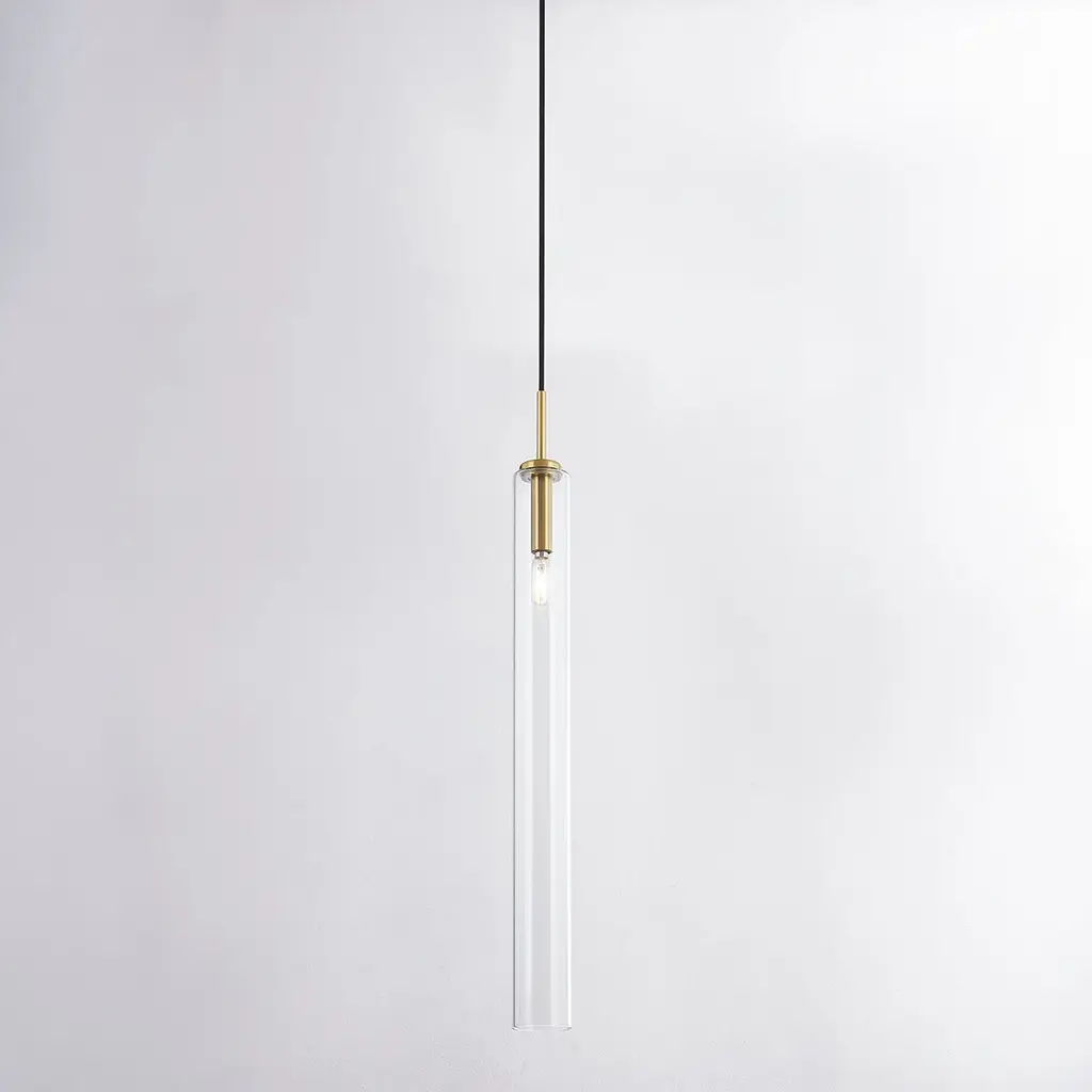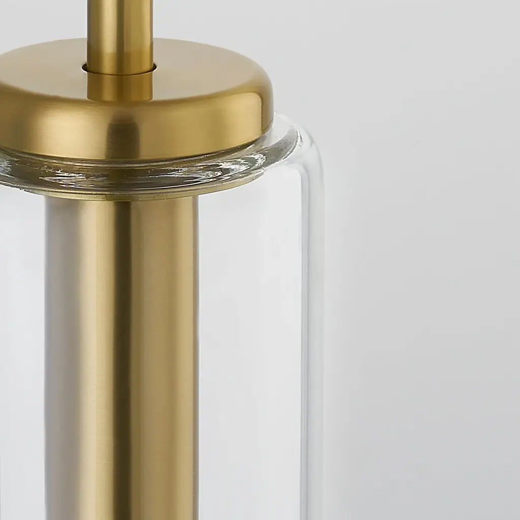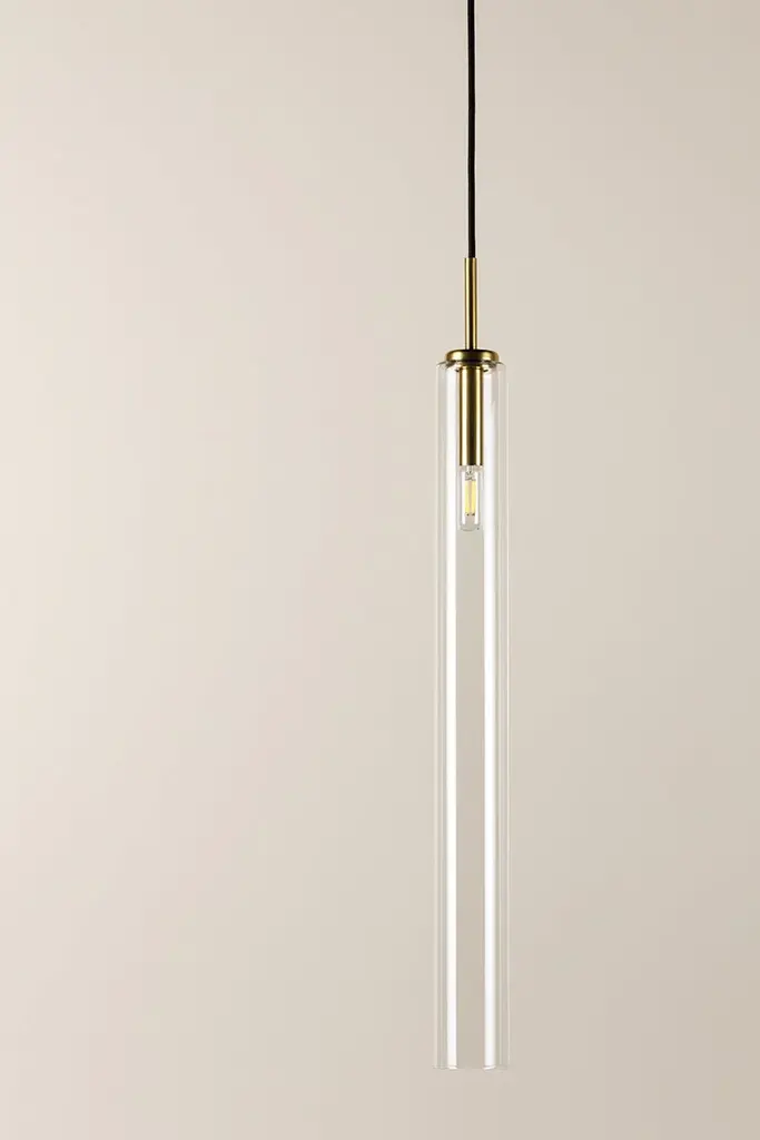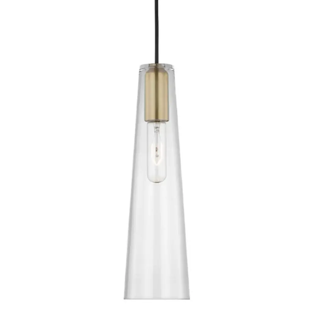 Streamlined in style, the Nyah Pendant delivers elevated proportions with an oversized glass shade. The aged bass socket is the perfect metallic accent, shining subtly in the tubular shade. Also available in a smaller size.