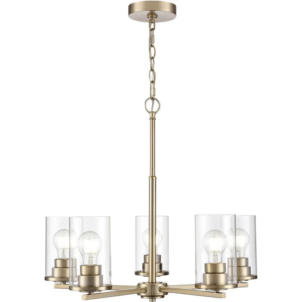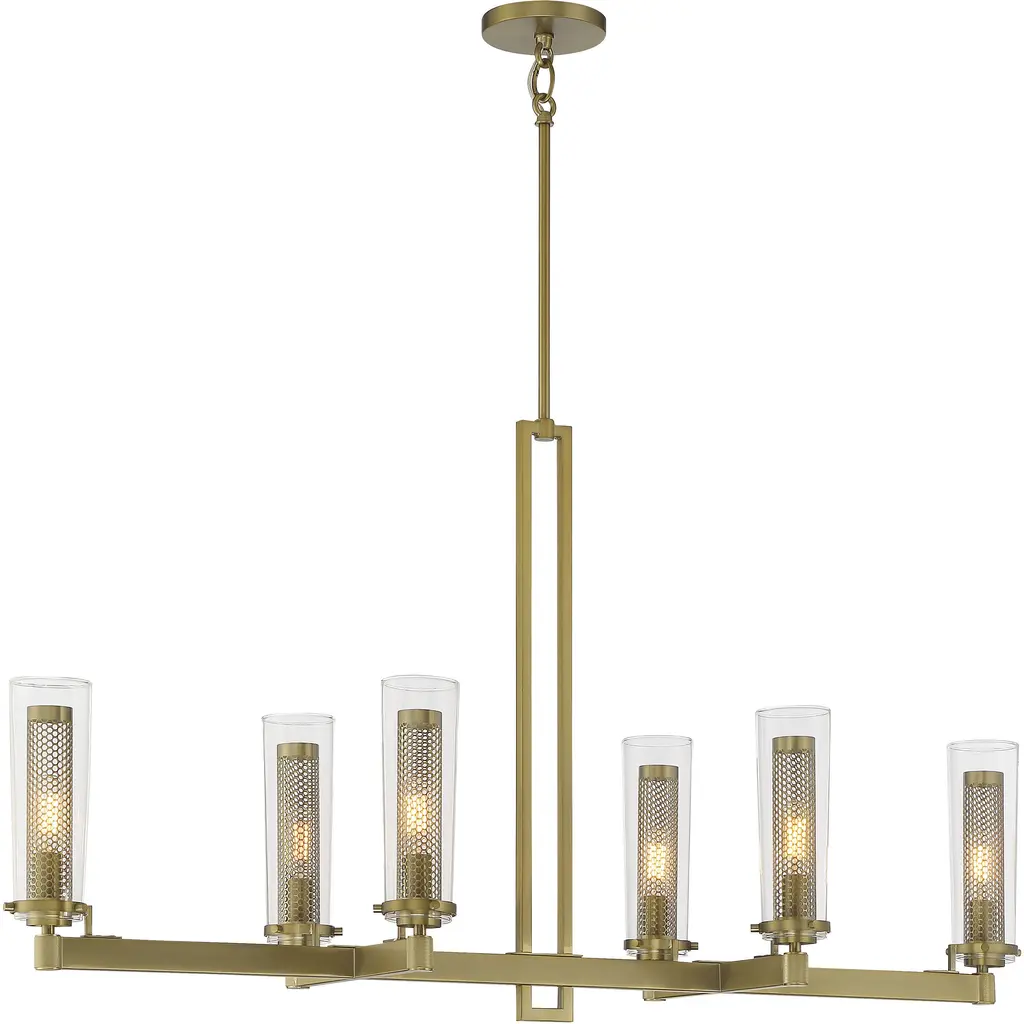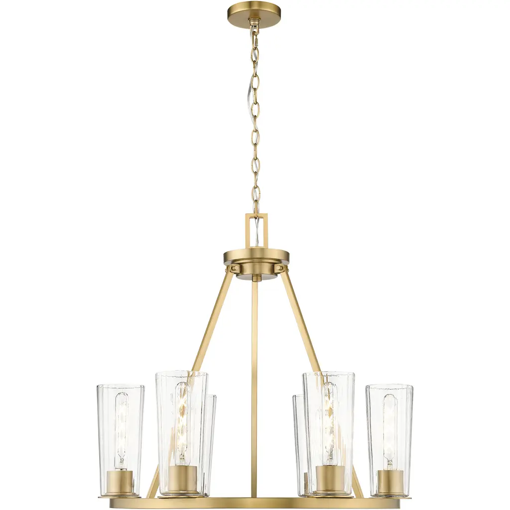 The Nye(TM) 14.75in. 8 light oval chandelier features a mid century modern design in Brushed Natural Brass and clear glass. A perfect addition in several aesthetic environments including contemporary and transitional.
