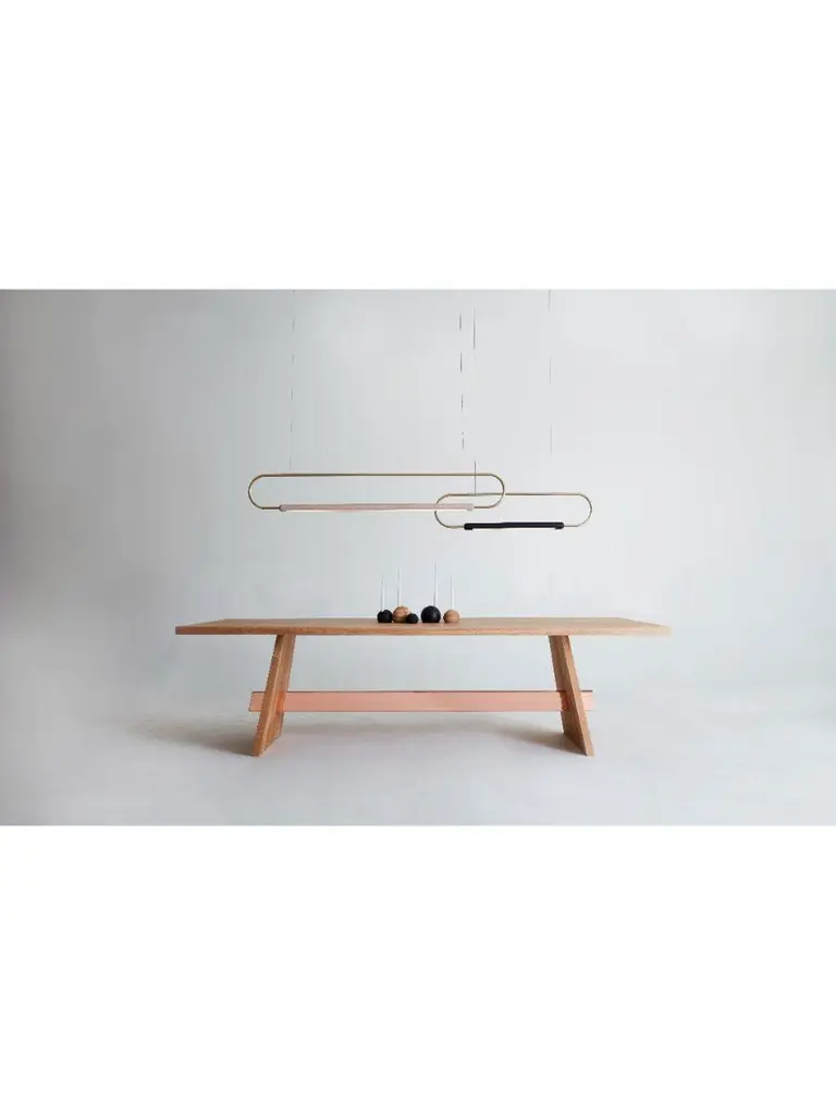 Oak large horizontal link pendant by Hollis & MorrisDimensions: 6ft x 75" x diameter 9"Materials: Solid wood, Bent Steel. Hardwax Oil. LED lights, powder-coated metal, or brushed metal finish. Suspension Hardware.Also available in Natural Oak, Black Oak, White Oak, and Walnut. Black, white, or brushed metal powder-coated finish. Available in other sizes.All our lamps can be wired according to each country. If sold to the USA it will be wired for the USA for instance.Inspired by the purity and strength of nautical hardware, Link abstracts a sailboat shackle into a graphic suspension light. Curved metal and rounded wood come together in this versatile loop that can be specified in either a horizontal or vertical orientation.Based out of Toronto, Hollis & Morris takes its name from an intersection in Halifax where the company started as a series of garage explorations in design. A steadfast commitment to function with a distinctive approach to design. Hollis & Morris creates handmade furniture and lighting which carefully balances modern and honest designs. Versatile, well crafted, and timeless. Pieces by Hollis & Morris easily complement residential, commercial, and hospitality spaces. Driven by respect towards natural and honest processes, trademark integrations of solid wood and metal celebrate the inherent strengths of each material, resulting in thoughtful, quality pieces made to last with you throughout the years.