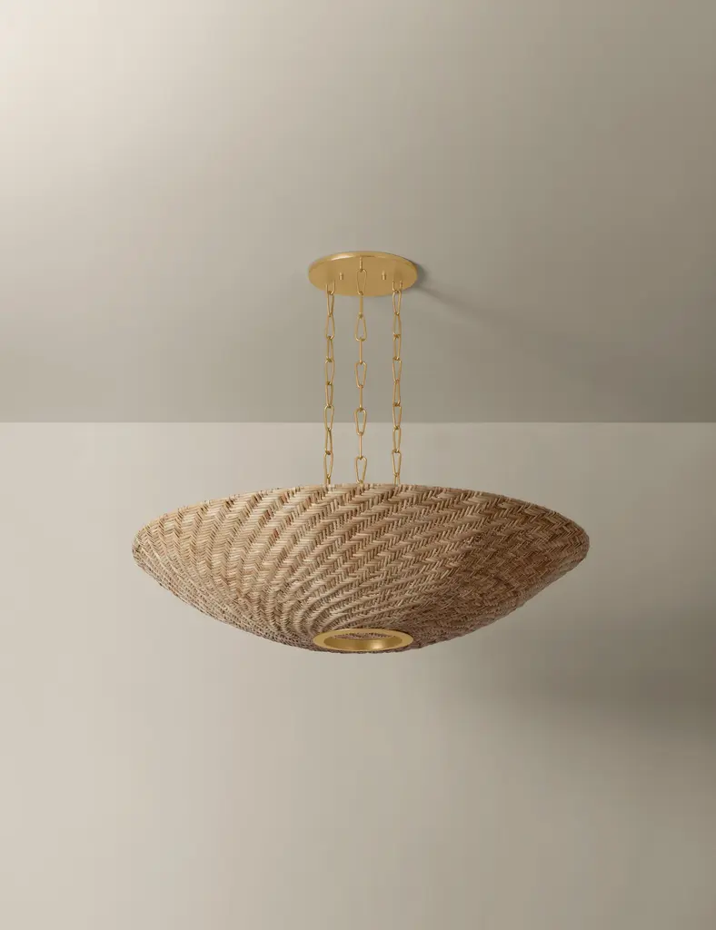 Modern, pared-down form language is brought to life through the unique materiality of Oaklyn. A Vintage Gold Leaf trough houses an LED light source, which projects upwards through a handwoven Lampanakay Rope shade. This thoughtful design allows light to diffuse through the shade, creating beautiful patterns on the ceiling. The coastal aesthetic is refined through the relationship between the organic fibers of the shade and the metalwork.Due to the one-of-a-kind nature of the medium, exact colors and patterns may vary slightly from the image shown.