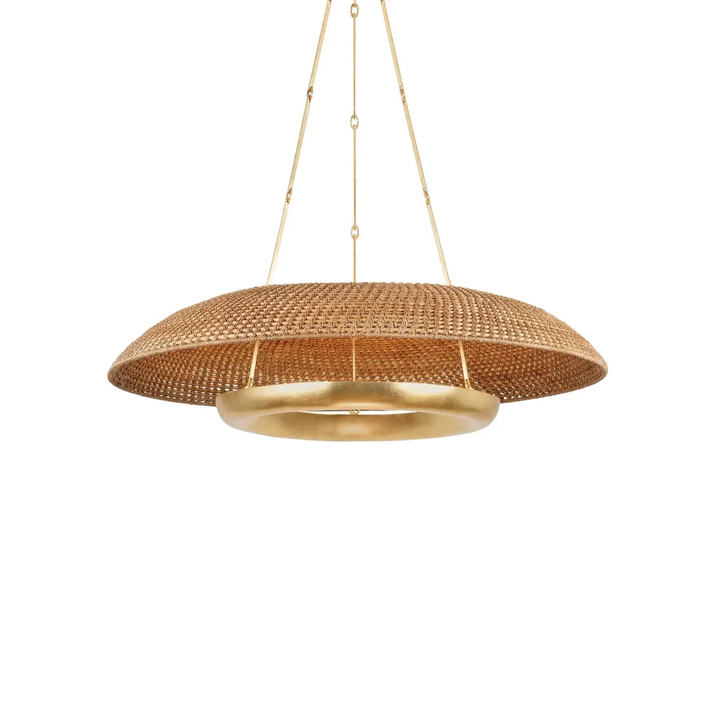 Modern, pared-down form language is brought to life through the unique materiality of Oaklyn. A Vintage Gold Leaf trough houses an LED light source, which projects upwards through a handwoven Lampanakay Rope shade. This thoughtful design allows light to diffuse through the shade, creating beautiful patterns on the ceiling. The coastal aesthetic is refined through the relationship between the organic fibers of the shade and the metalwork. Features