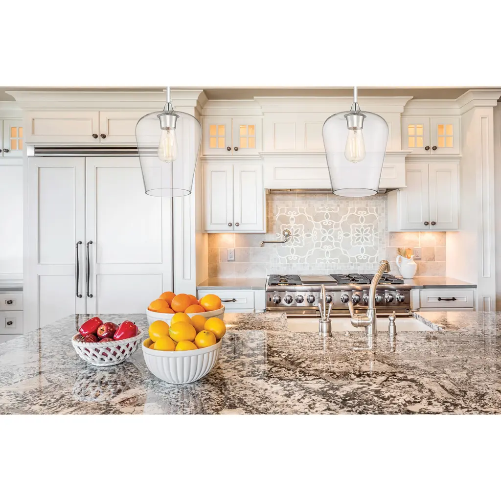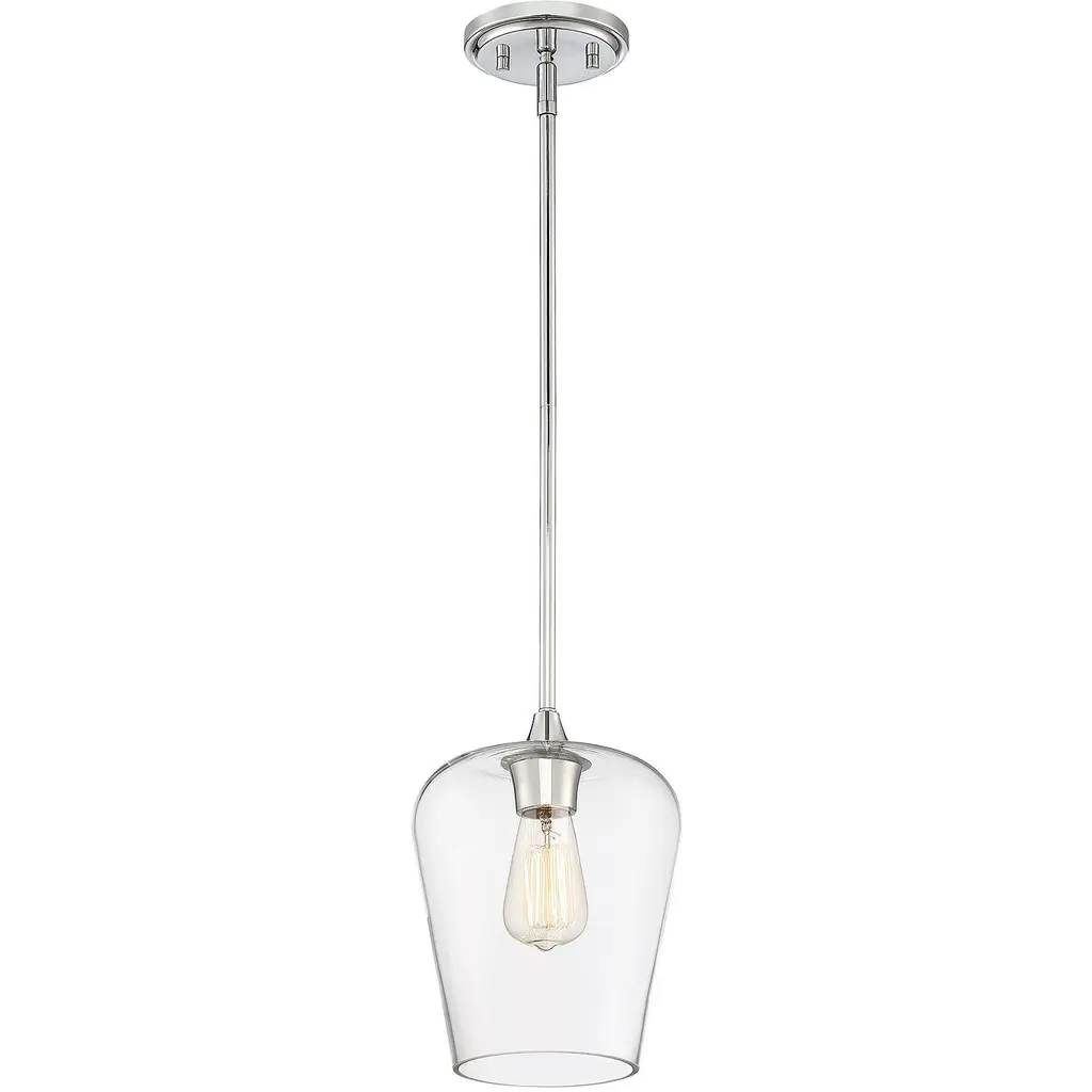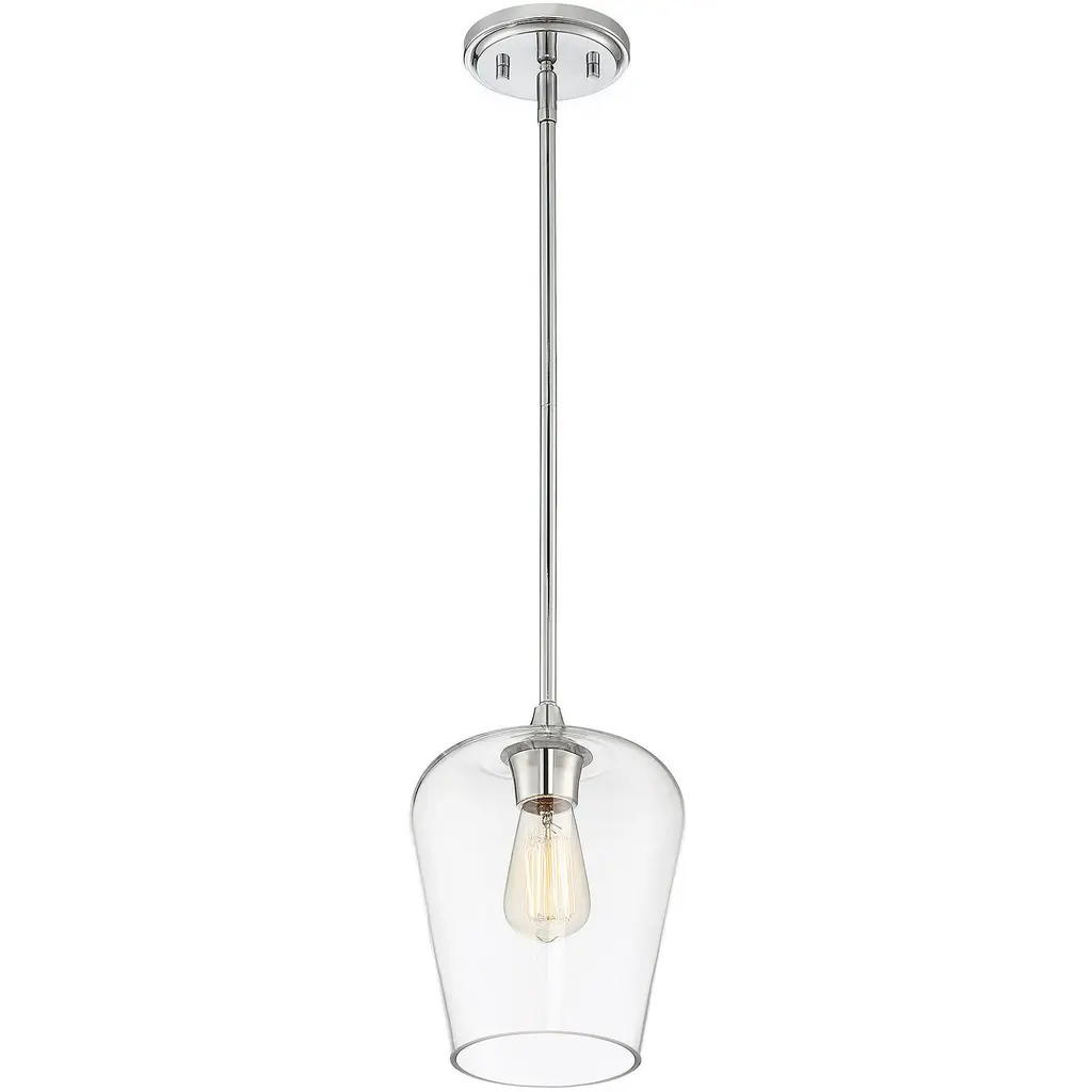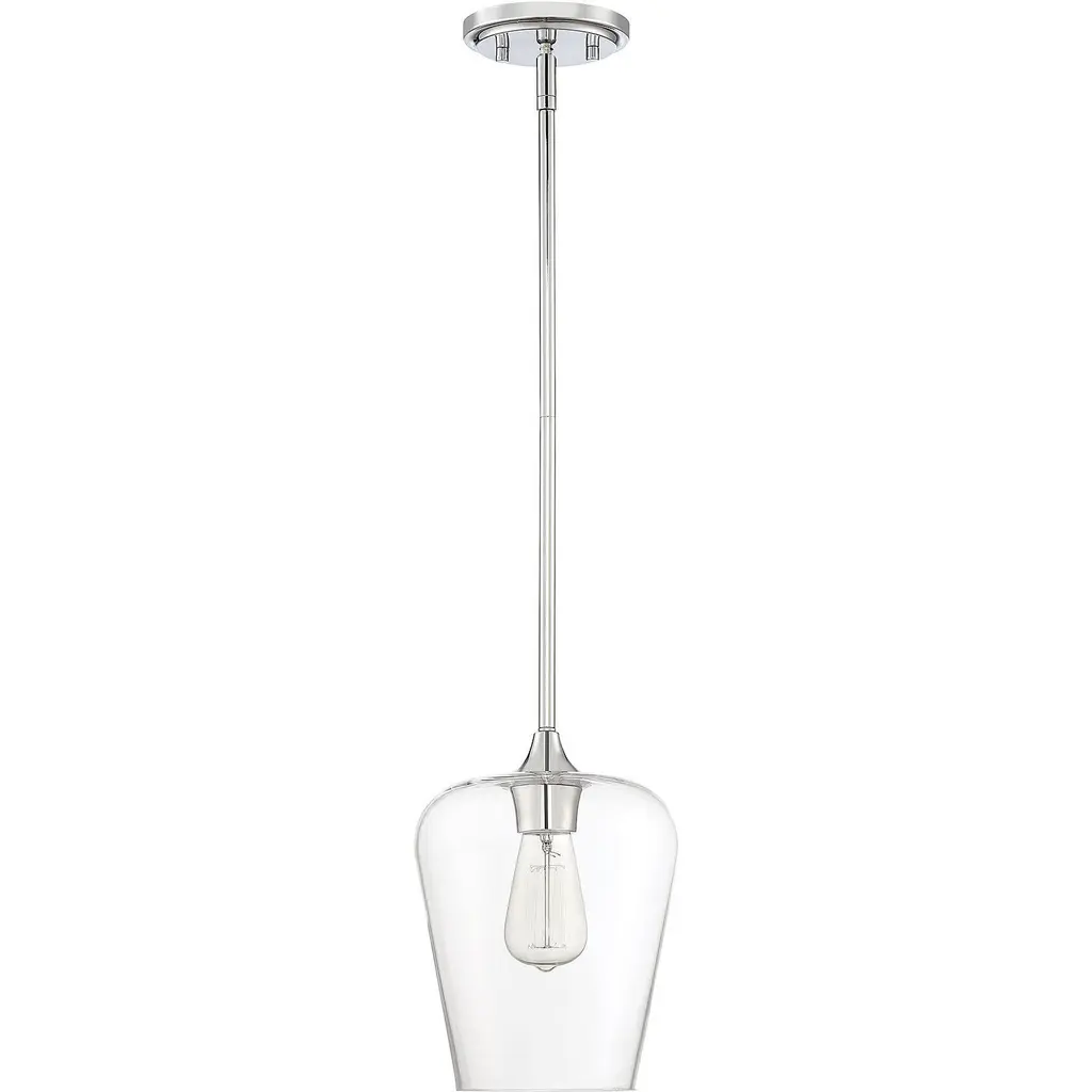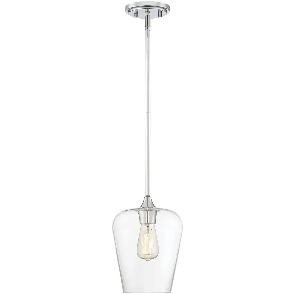 Get a pendant look with understated elegance when you get the Savoy House Octave 1-light pendant. It features a shade of curved clear glass, minimal detailing and a sleek polished chrome finish. Pendants are extremely versatile and can fit in many different spaces, such as kitchens, family rooms, great rooms, foyers, entryways, offices, bedrooms and bathrooms. The hanging height is adjustable and this pendant can be used on a sloped ceiling. Since the bulb is exposed, try using a stylized bulb (not included) like Edison style for a different twist The chrome finish can be paired with chrome hardware or mixed with hardware in other finishes. Try the Octave with glam, transitional or contemporary style rooms for a chic look. When you choose a Savoy House lighting fixture, you can be certain you've selected a piece that will withstand the test of time.