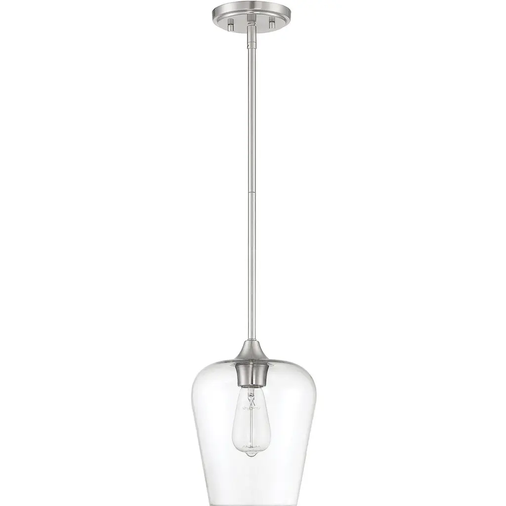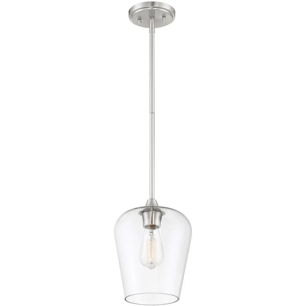 In the Savoy House Octave 1-light pendant, a bold, light-colored frame and streamlined silhouette create an air of elegance and sophistication. The satin nickel finish and large clear glass shade go with absolutely everything. Whether you have transitional, contemporary, bohemian or other decor styles in your home, youll love the way this Octave fixture stylishly blends in. At 8" wide by 10.5" high, this pendant is a perfectly graceful, proportionate size whether used solo or in groupings. The curved glass shade has a sleek, uncluttered look and one 60W standard size bulb provides lovely light for clean, casual style in your dining area, living room, kitchen, foyer, bedroom, bathroom, hallway, family room, office, great room or stairway.