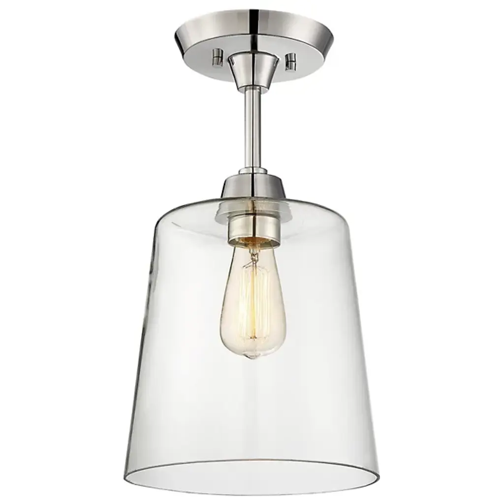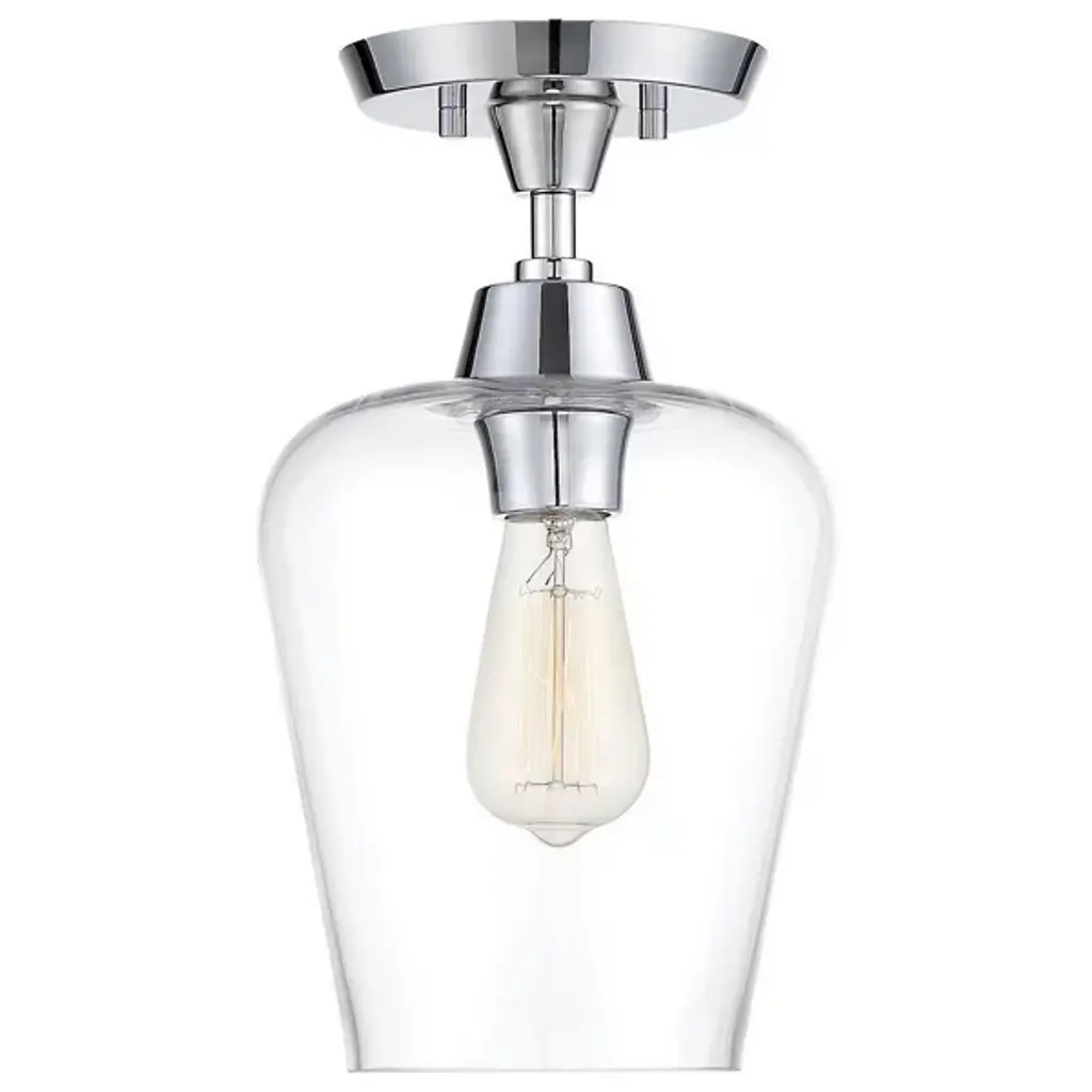 Understated sophistication. The Octave Semi-Flushmount by Savoy House exudes elegant simplicity with its attractive arrangement of upscale yet minimal details. Its curved glass shade resembles an upside-down cabernet glass and shows a clear view of the light source (bulb not included) as it casts a warm and welcoming glow into your space. Its metal canopy also comes in optional finishes and sits close to the ceiling, making this semi-flushmount optimal for a kitchen or foyer.