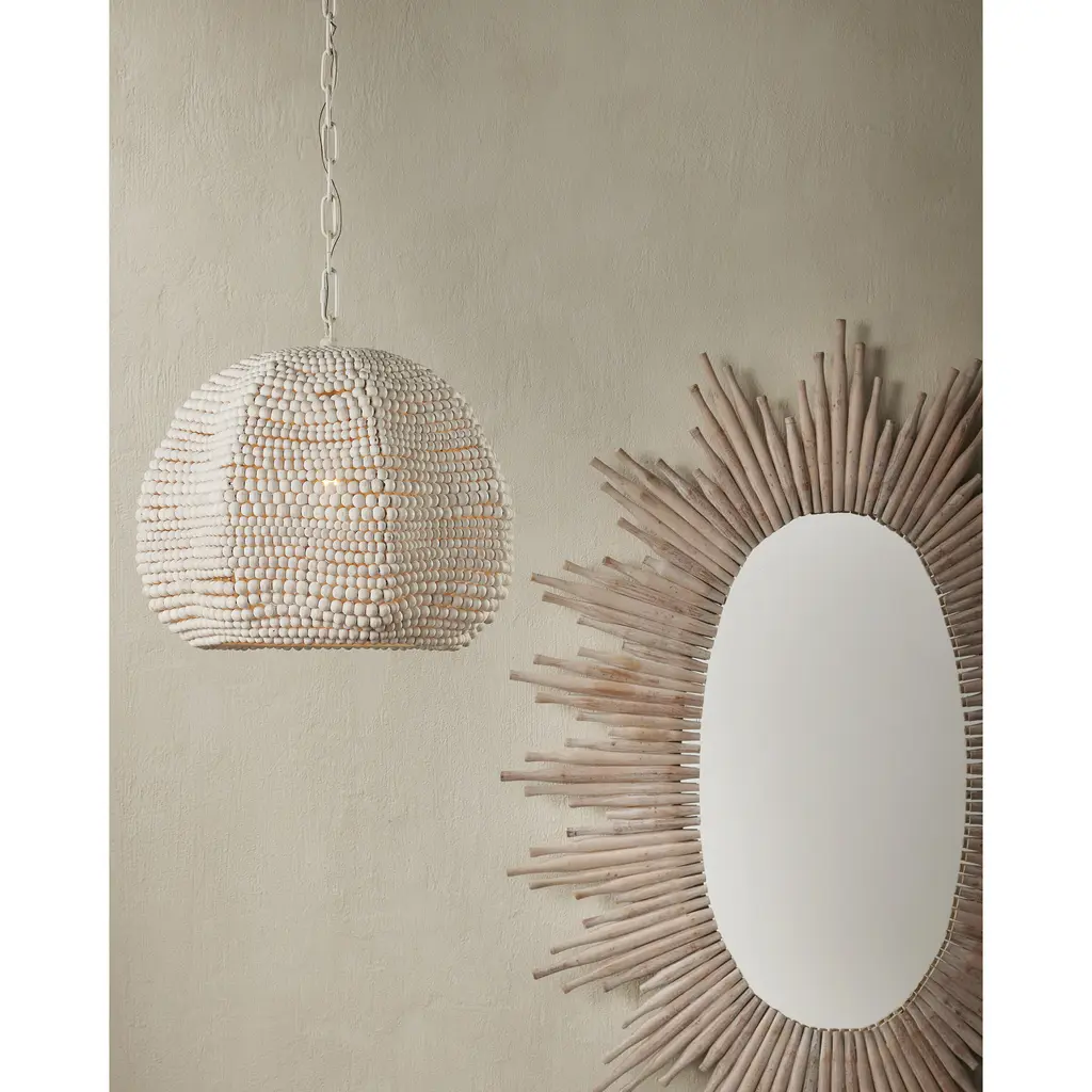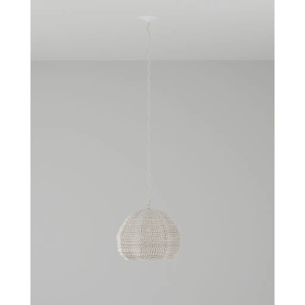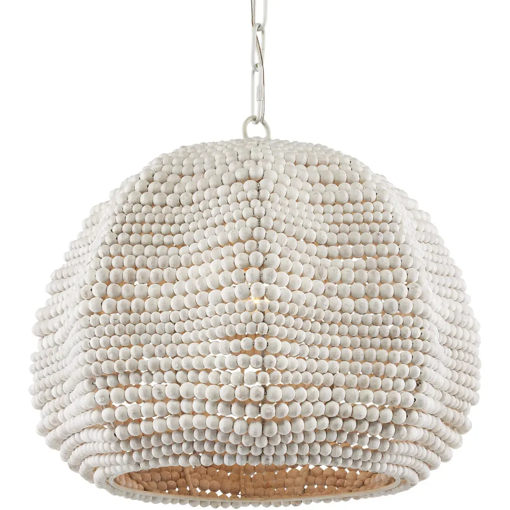 The Octavia Pendant has a flowing profile made of wood beads that have been whitewashed and strung along metal wire so that the shape will remain whimsical. This white pendant fits perfectly within the coastal design aesthetic that is sought after for interiors. The desire for casual elements that hold up to the highest design standards is driving this movement.