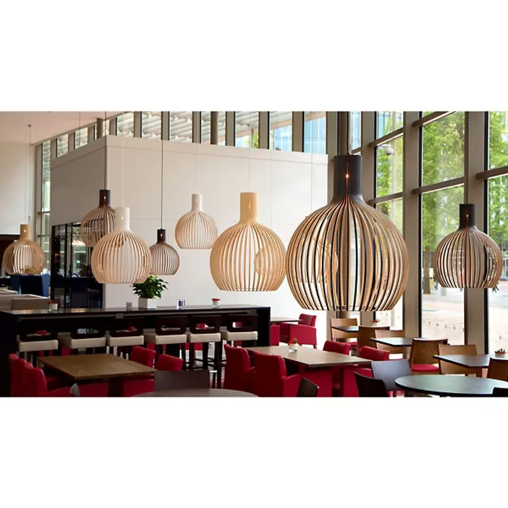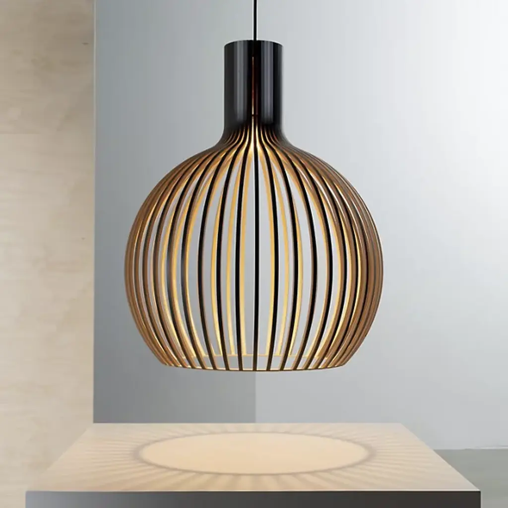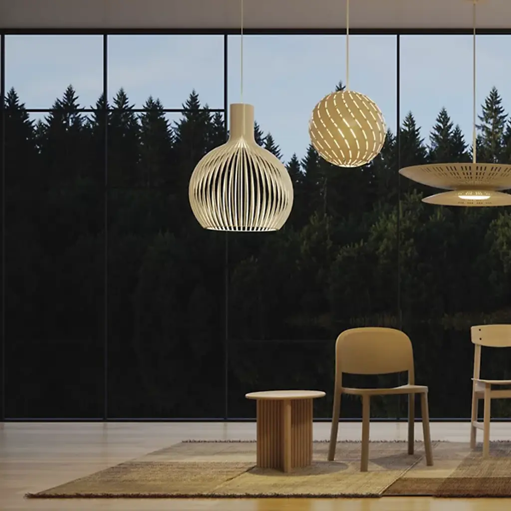 Airy, wondrous, elegant. Inspire and delight with the floating wood composition of the Octo 4240 Pendant from Secto Design. The artful piece comes through with an inviting personality, one refined by Finnish designer Seppo Koho in his handcrafted wooden prototyping process. The pendant uses Finland’s national tree, the birch, for its sustainable wood construction. Artisans begin by form pressing slender birch wood slats into flowy contours. One at a time, the contours are arranged in a circle, creating an airy, curve-wrapped form. The minimalist yet sculptural form surprises as it conceals the light source. A single bulb on top beams a warm light through the open design, creating an energetic play of light and shadow. Softness describes the light filtering through the contours and streaming through the wide opening at the base.