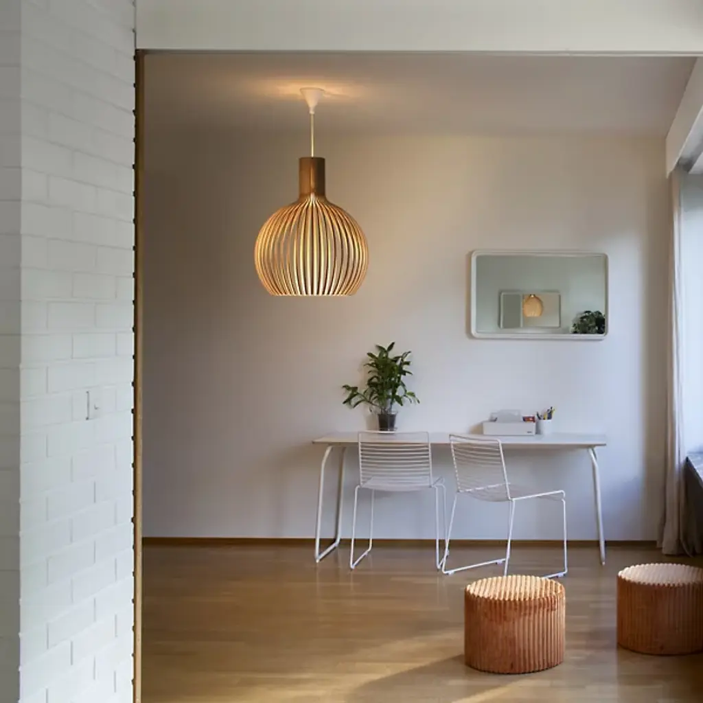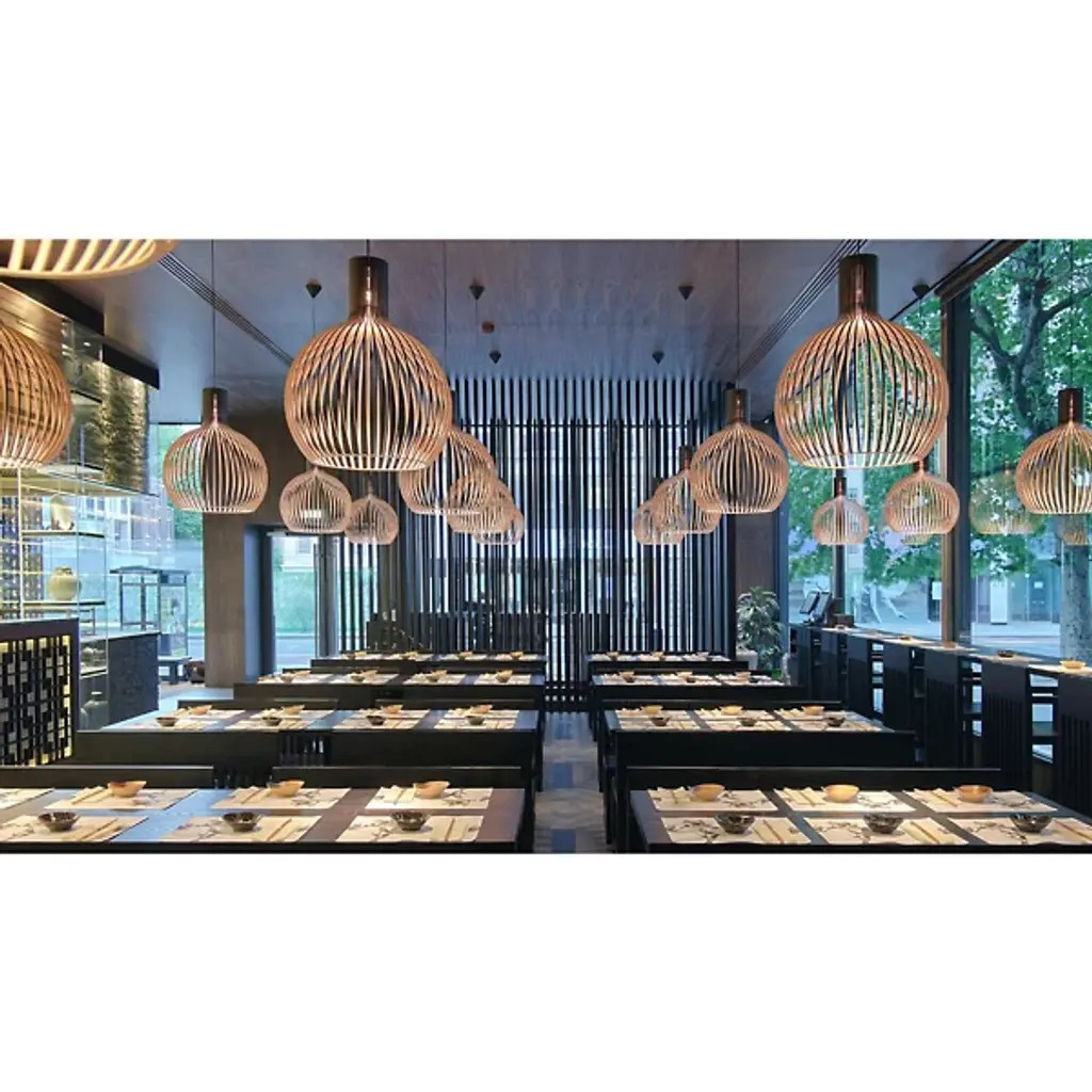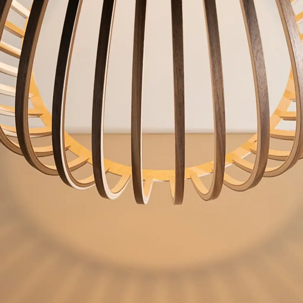 Airy, wondrous, elegant. Inspire and delight with the floating wood composition of the Octo 4240 Pendant from Secto Design. The artful piece comes through with an inviting personality, one refined by Finnish designer Seppo Koho in his handcrafted wooden prototyping process. The pendant uses Finland’s national tree, the birch, for its sustainable wood construction. Artisans begin by form pressing slender birch wood slats into flowy contours. One at a time, the contours are arranged in a circle, creating an airy, curve-wrapped form. The minimalist yet sculptural form surprises as it conceals the light source. A single bulb on top beams a warm light through the open design, creating an energetic play of light and shadow. Softness describes the light filtering through the contours and streaming through the wide opening at the base.