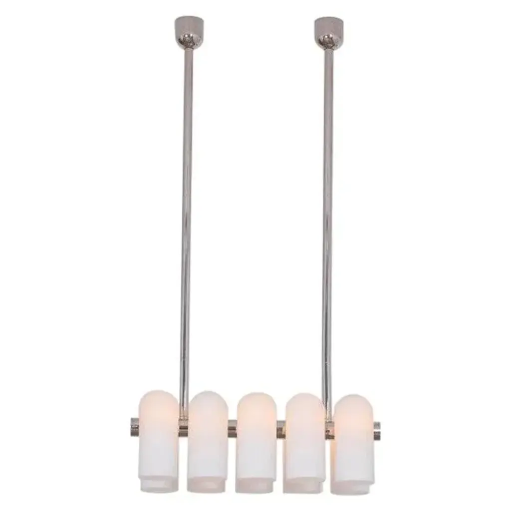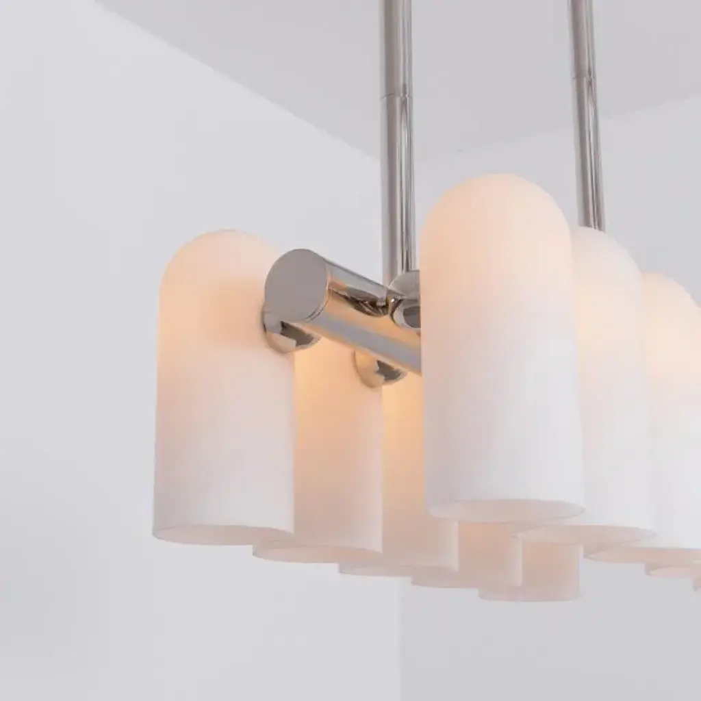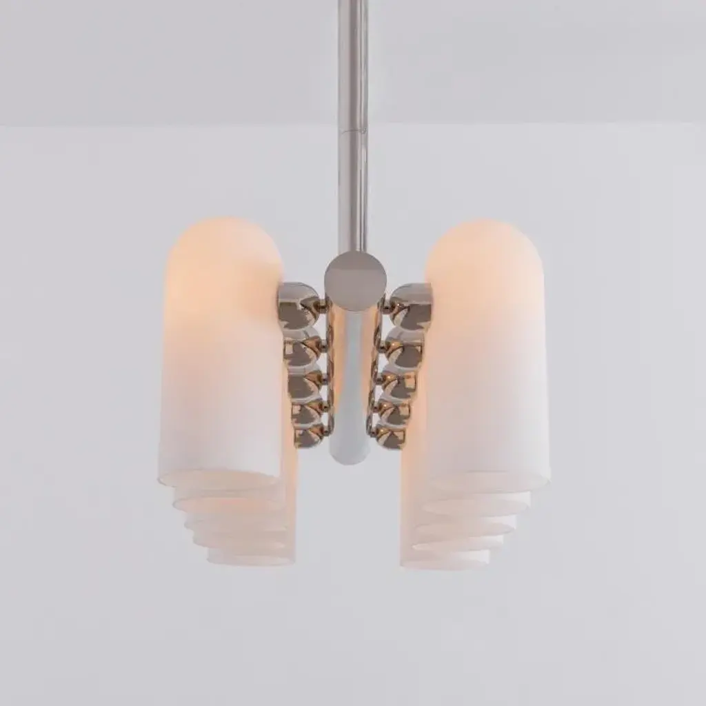 Odyssey linear sm polished nickel chandelier by schwung dimensions: w 114 x d 31 x h 132 cm materials: polished nickel, frosted glass finishes available: black gunmetal, polished nickel, brass schwung is a german word, and loosely defined, means energy or momentum of a positive manner. Synonyms: verve, zest, panache, momentum. Mission developing lighting fixtures through simple and timeless materials, sustainably, we are committed to creating quality products that last. Beginning with the design we are constantly refining aesthetic and function. Both in the lamps themselves and throughout the manufacturing process we pursue a holistic approach to efficiency, and the reduction of environmental impact. Concept schwung is a lighting concept, connecting aesthetic and quality through matter. An exploration of history, forms and function, elegantly fulfilling an essential need of modern life, capturing light. Our pieces play with architecture or create spaces of their own. up to 250v (europe/uk standard).