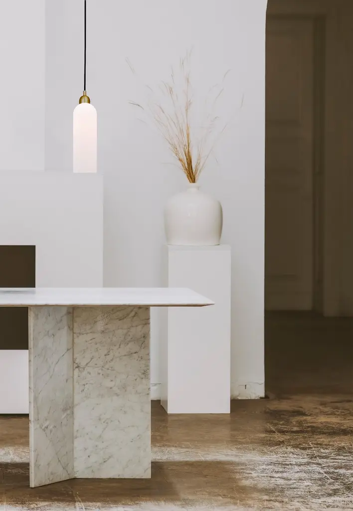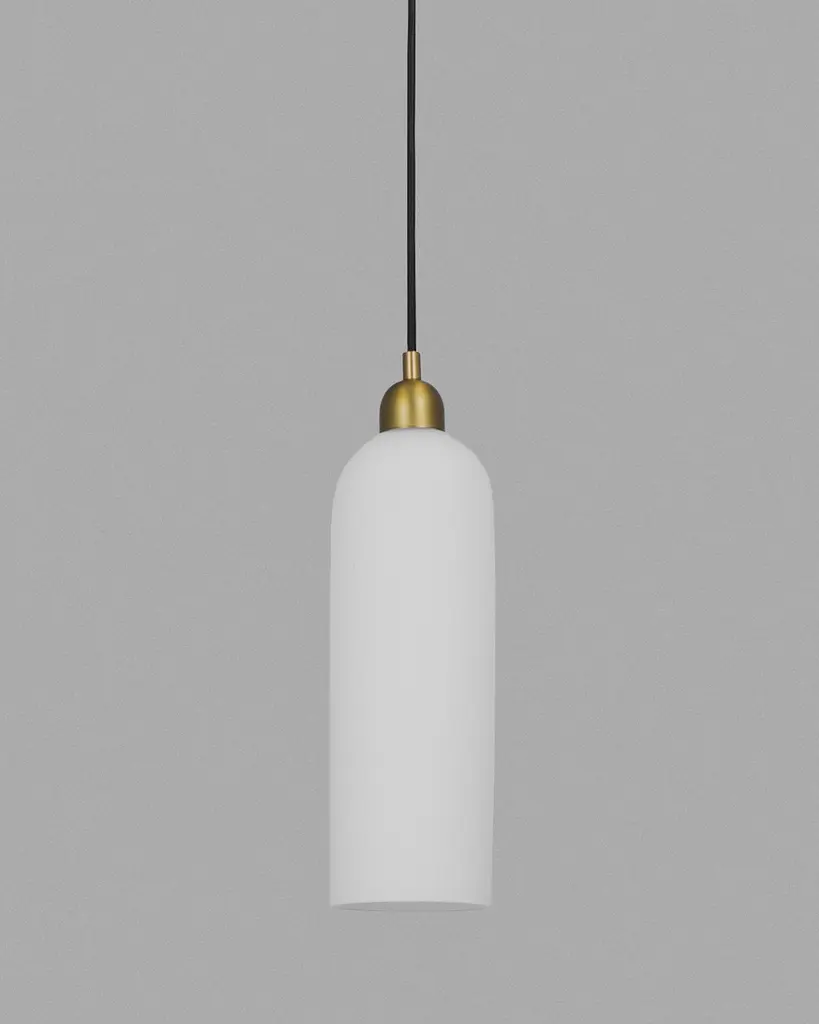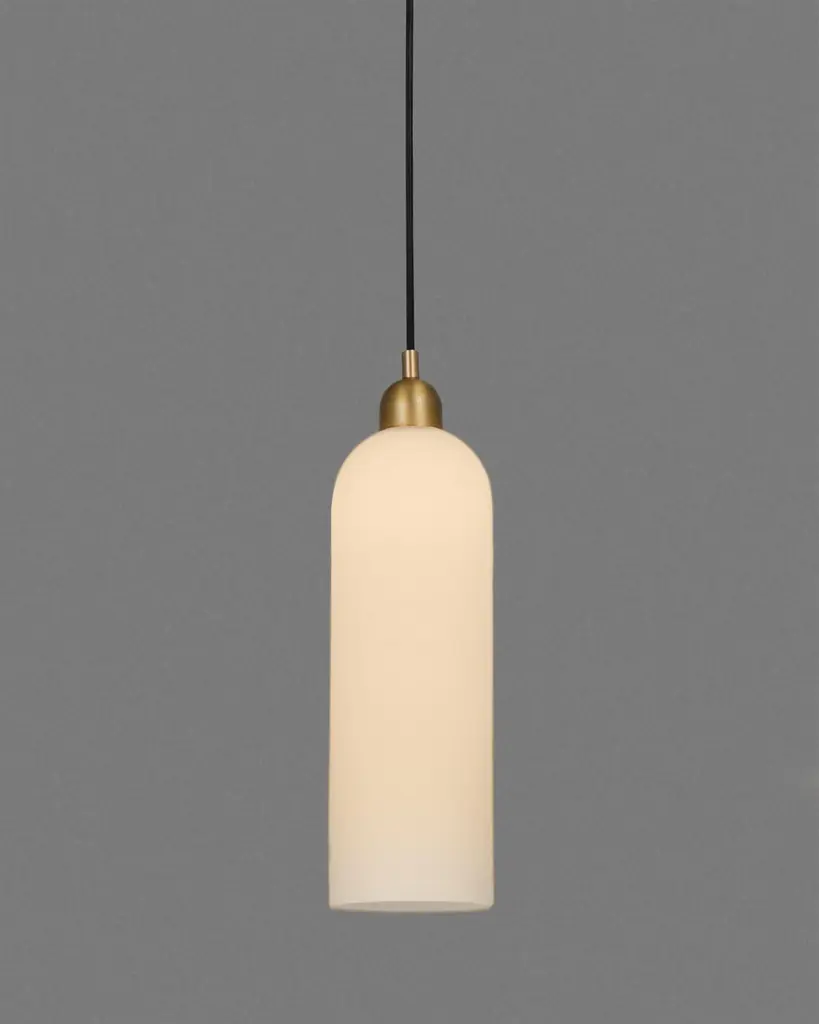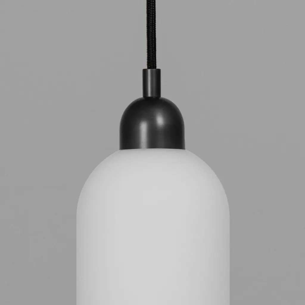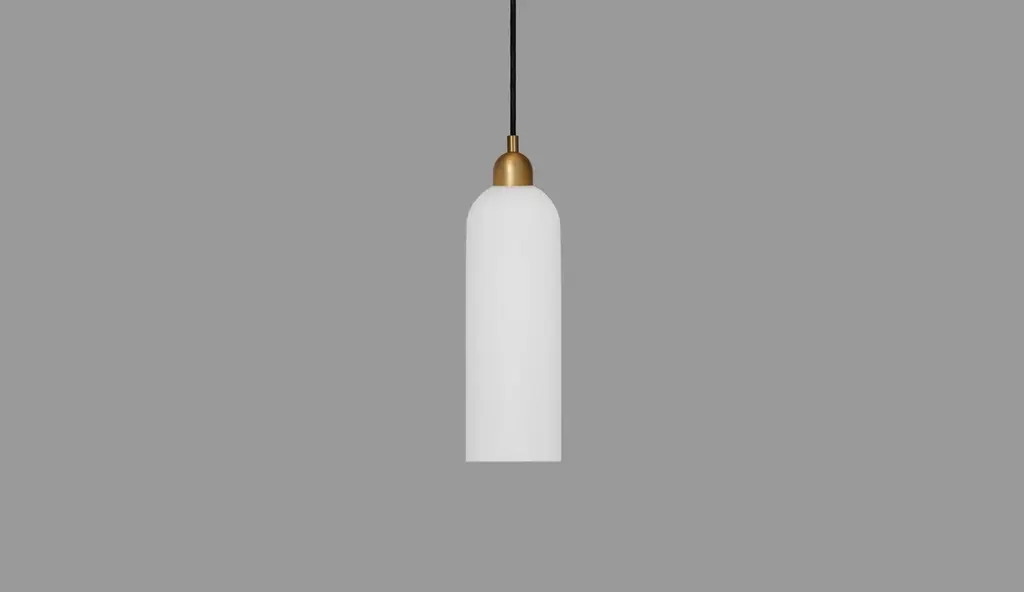 A distinctive arched cloche hovers gracefully dispersing light through layers of glass. Blown into cast-iron molds, opaline cylinders are composed in a unique and classical shape.Available in our three signature finishes: Lacquered Burnished Brass (LBB); Black Gunmetal (BGM); Polished Nickel (PN)Odyssey CollectionCome with us on a voyage. To a distant dreamscape where curious wanderers roam. Captured in motion, these gentle machines are destined for the future even as they recall the comfort of home.Playful varieties of shape are composed through a geometric language of pure form, transporting us to scales, and places from our memory and imagination.Dimensions:Diameter: Ø 100 mm / Ø 3.9''Height: 401 mm - 3401 mm / 15.8'' - 133.9''Weight: 1.3 kg / 2.9 lbLight sources available:LED Bulb (included) 1 x 5 W.