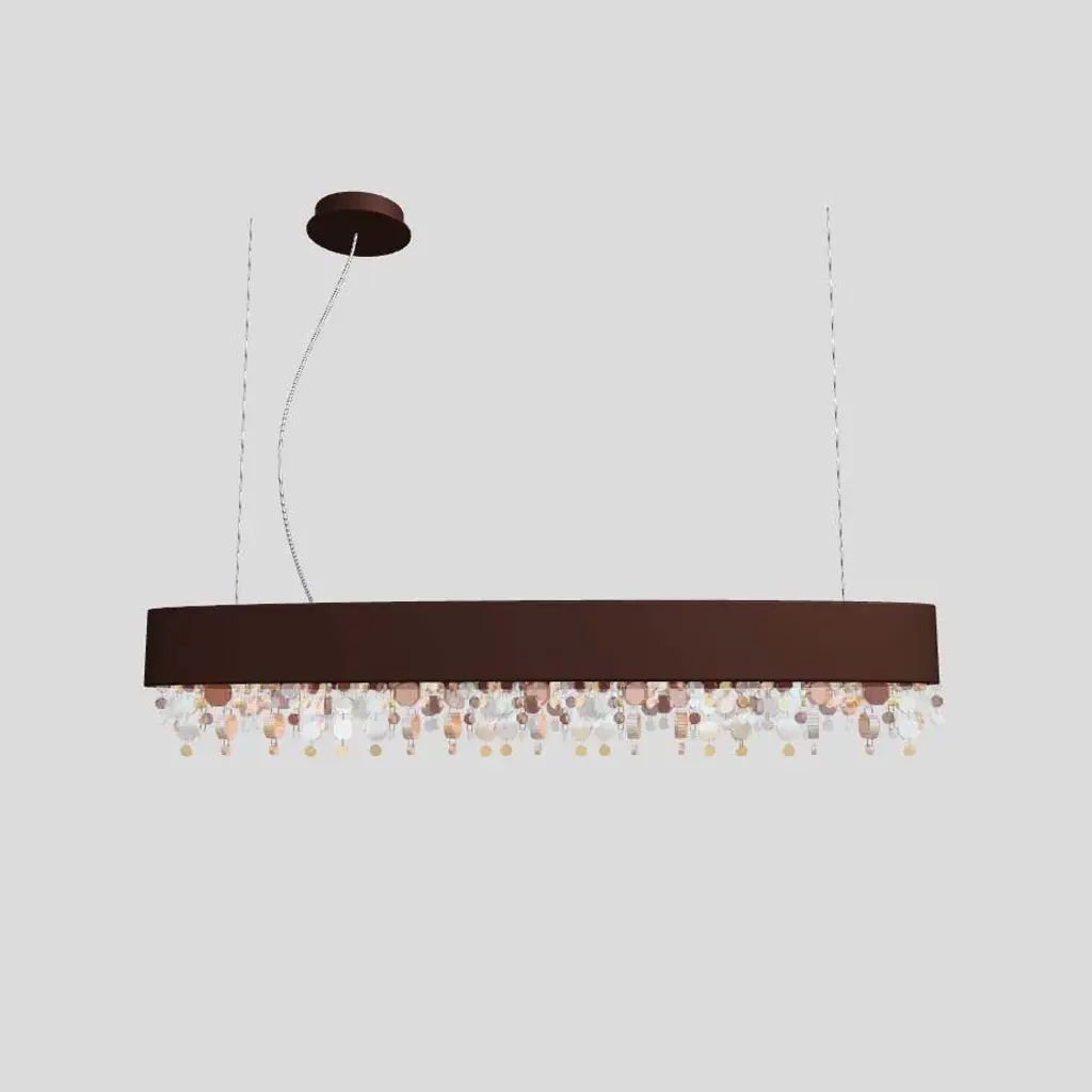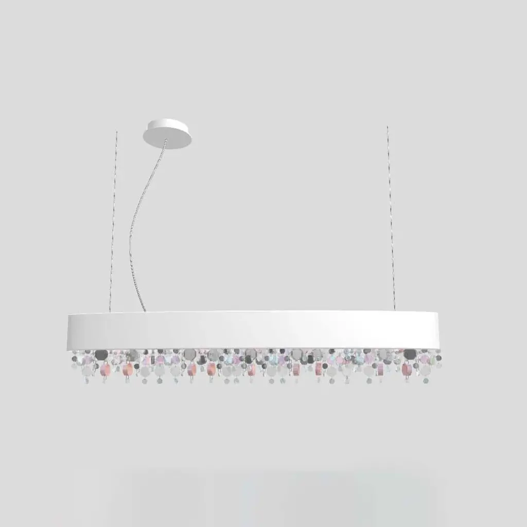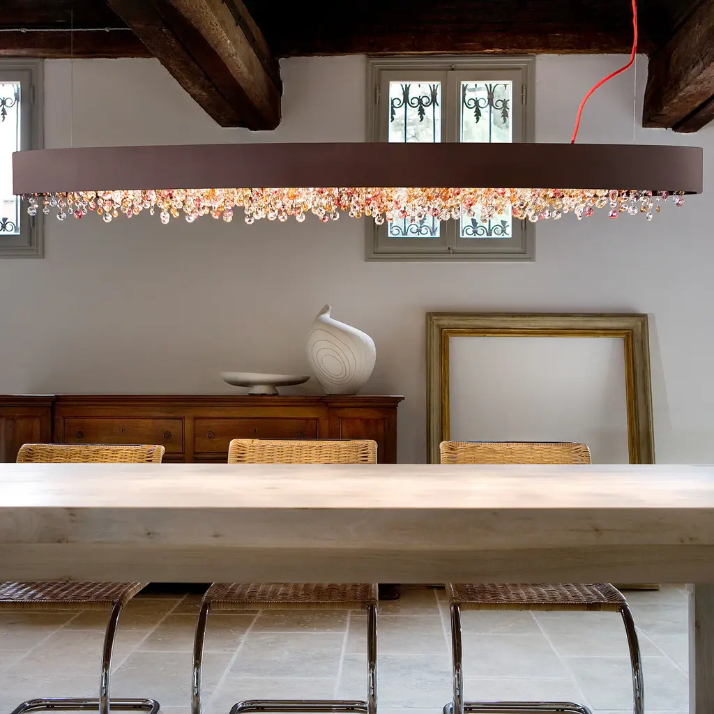 Add eye-catching allure to your space with the Ola Oval Large Pendant Light from Masiero. This contemporary masterpiece combines handsome metallics with gleaming gems, and features a continuous expanse of coated Italian glass strands for a touch of luxury. Available in four finishes and complemented by cascading colored crystals, Ola offers four unique looks to suit any interior. Highlights