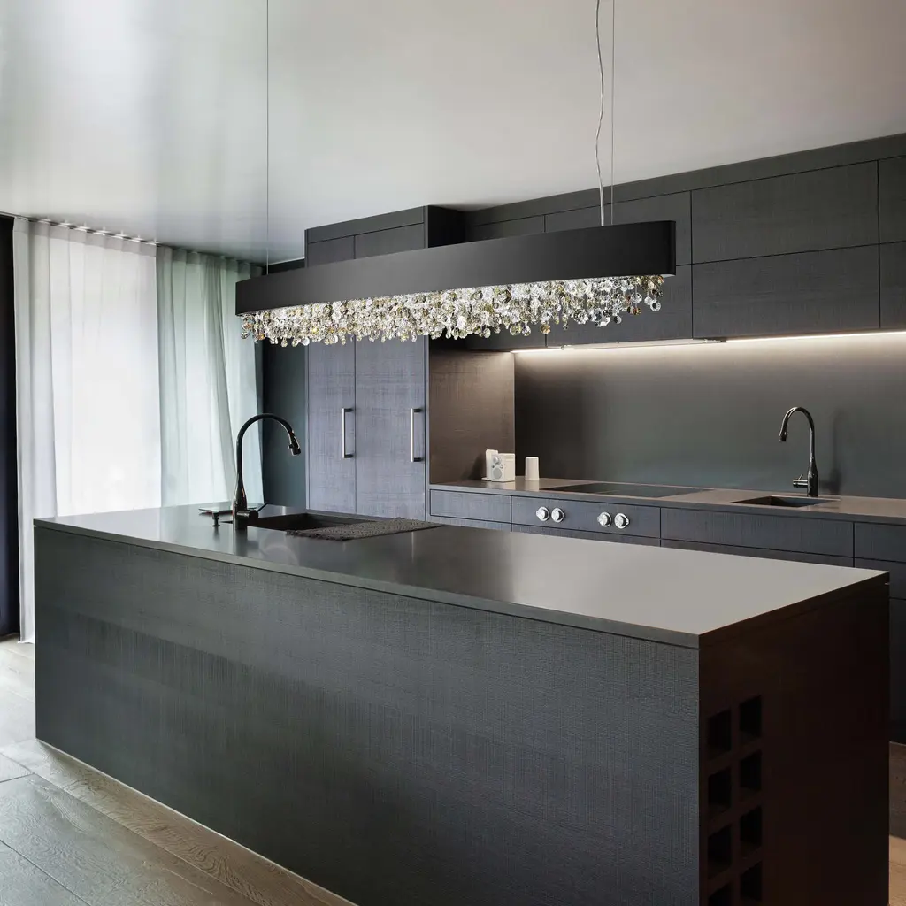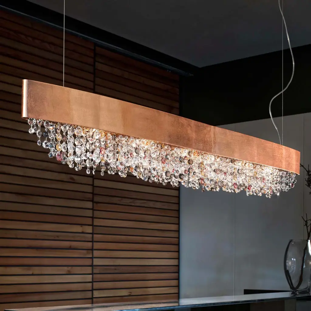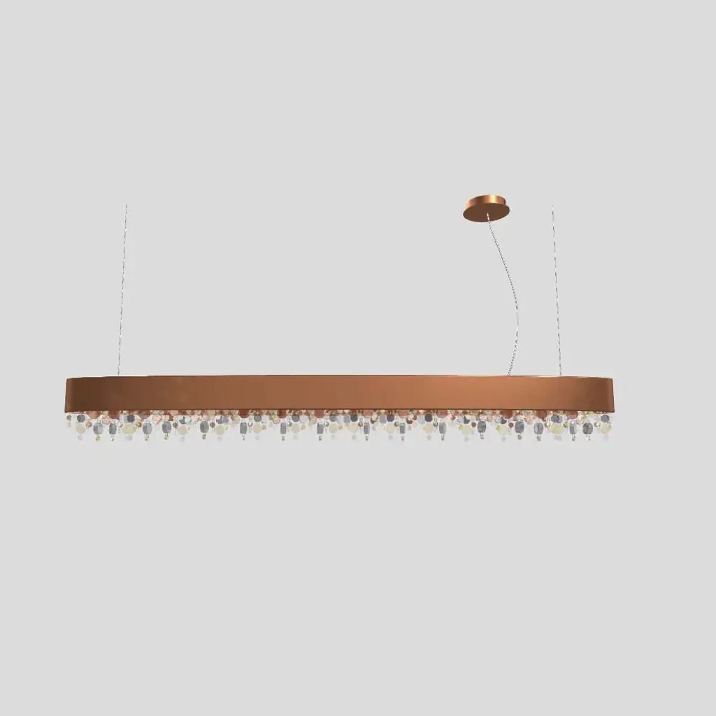 Add eye-catching allure to your space with the Ola Oval Large Pendant Light from Masiero. This contemporary masterpiece combines handsome metallics with gleaming gems, and features a continuous expanse of coated Italian glass strands for a touch of luxury. Available in four finishes and complemented by cascading colored crystals, Ola offers four unique looks to suit any interior. Highlights