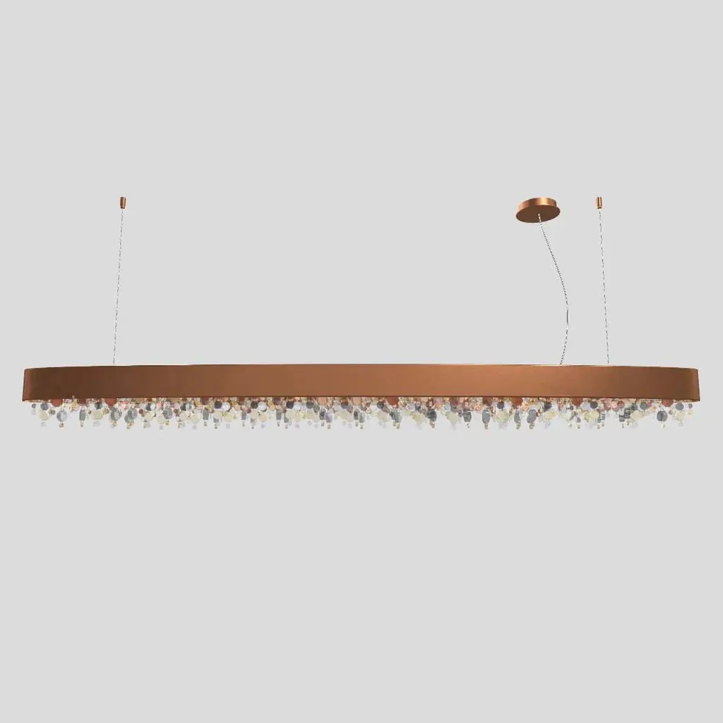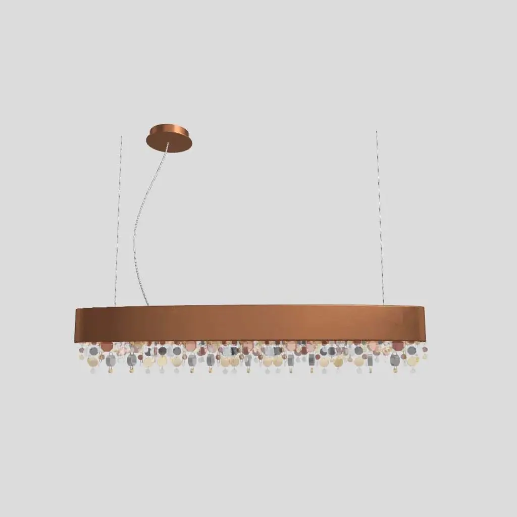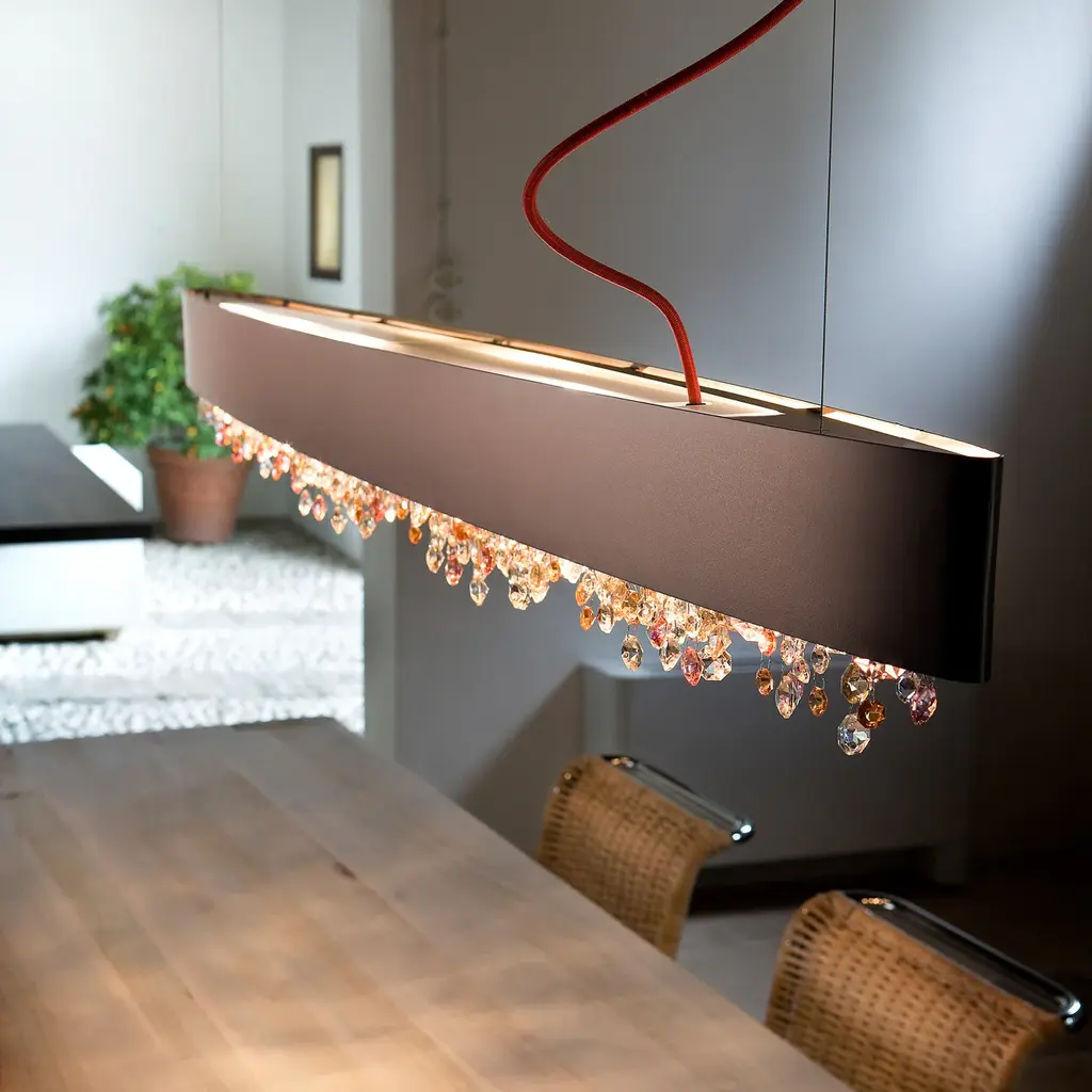 Add eye-catching allure to your space with the Ola Oval Large Pendant Light from Masiero. This contemporary masterpiece combines handsome metallics with gleaming gems, and features a continuous expanse of coated Italian glass strands for a touch of luxury. Available in four finishes and complemented by cascading colored crystals, Ola offers four unique looks to suit any interior. Highlights
