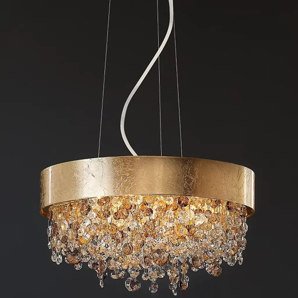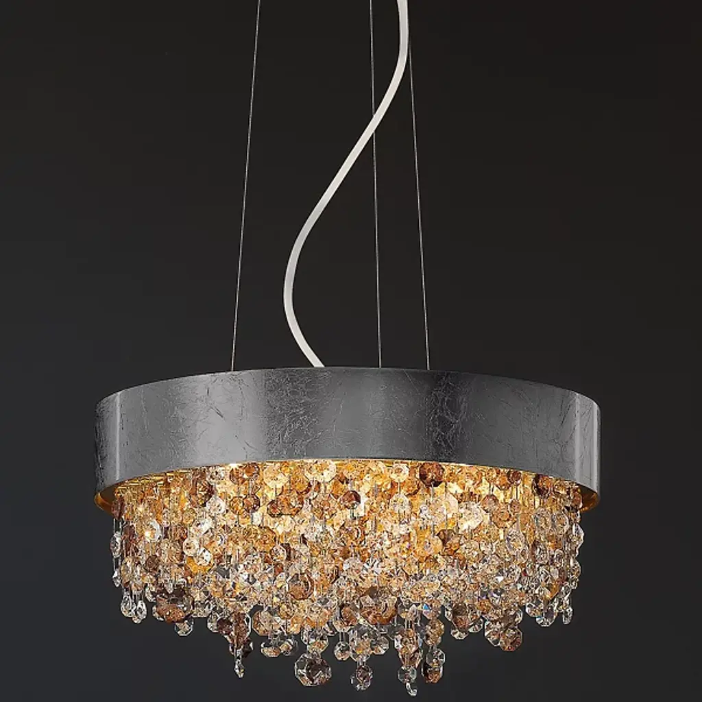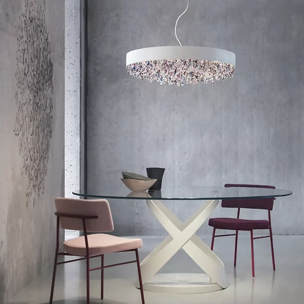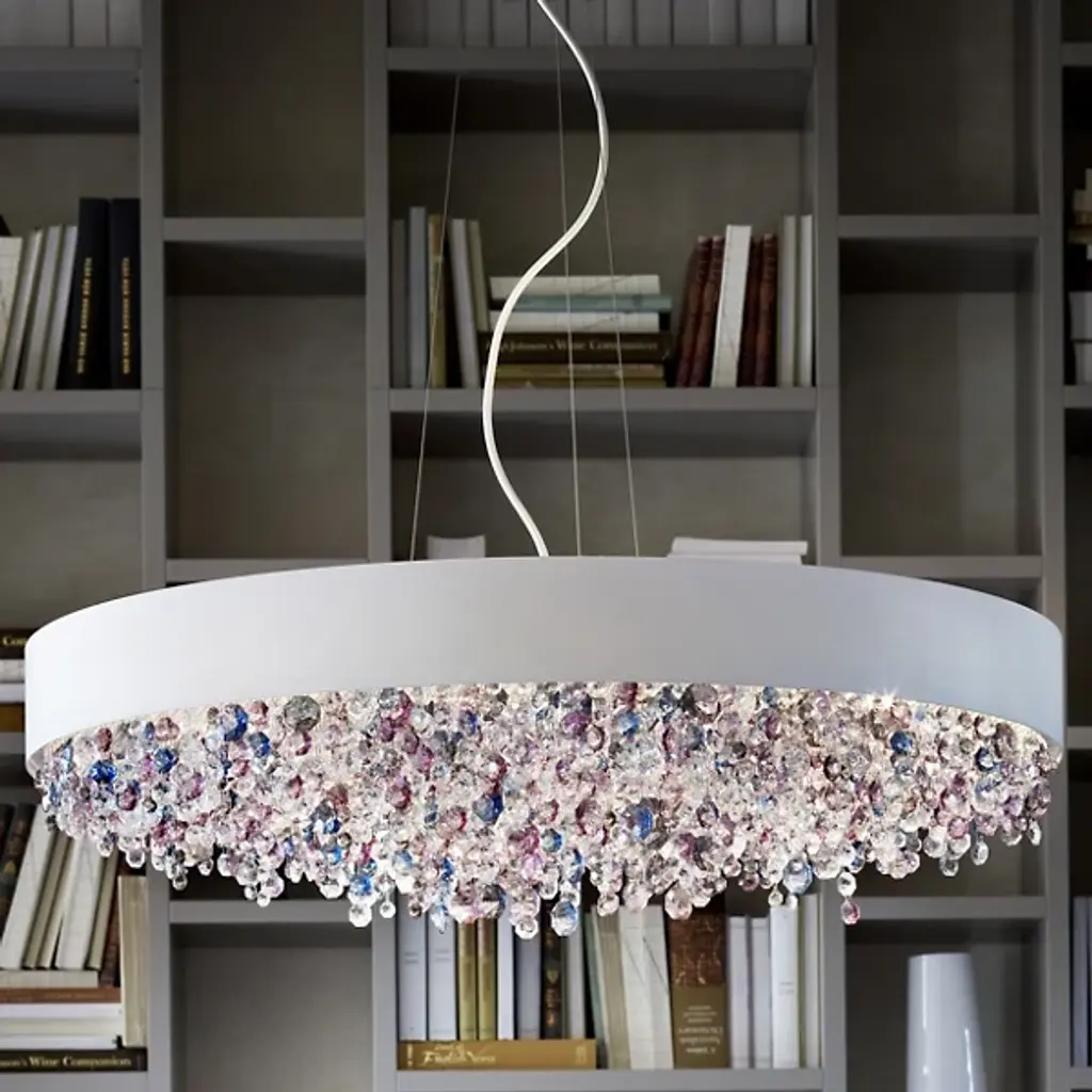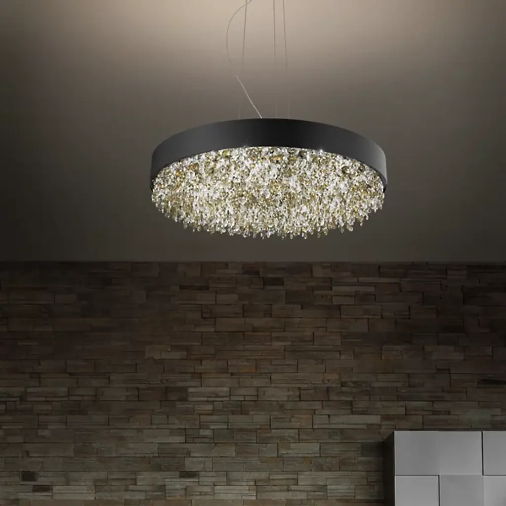An isolated downpour of luminescence, the Masiero Ola Pendant features compacted strands of coated Italian glass jewels spilling out of its rounded frame. Ola is available in four finishes, each finish displaying an individual assortment of cascading colored crystals. The different styling arrangements result in four unique looks that complement a wide range of interior spaces.