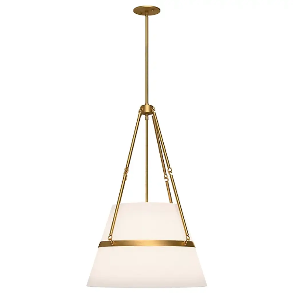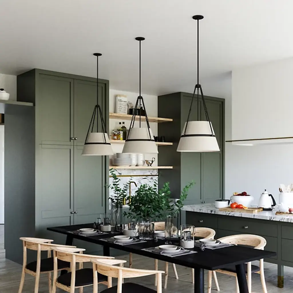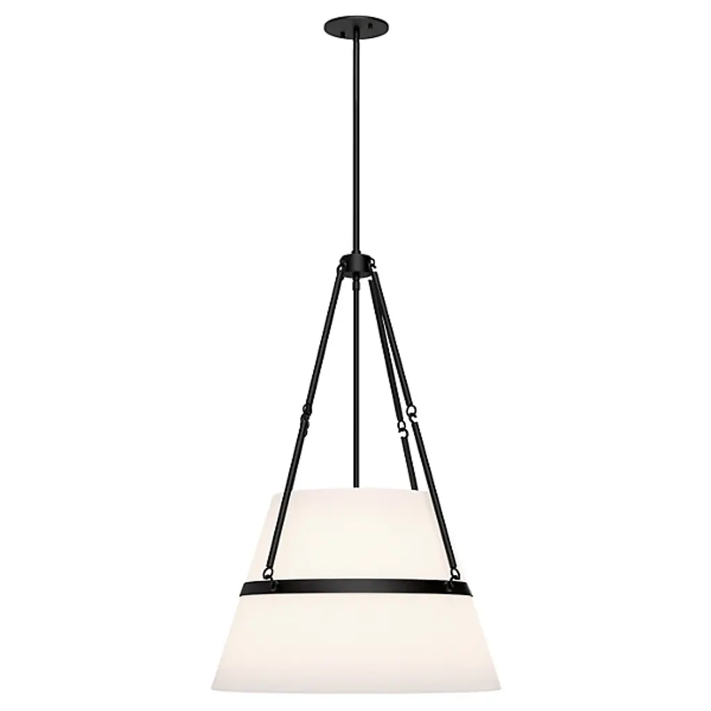 Sophistication through precision. Bring down a comfortable and bountiful glow into the communal setting with the Oliver Pendant from Alora Mood. The pendant complements the dashing lines of the home’s contemporary décor with its sharp suspension. Downrods come together to create a pointy silhouette that stands out like a graphical image in front of the soft linen. The linen shade produces a familiar drum form for reduced glare from the sides and a funneling light trajectory. This light ups the ambiance and warmly glazes the surfaces below it.