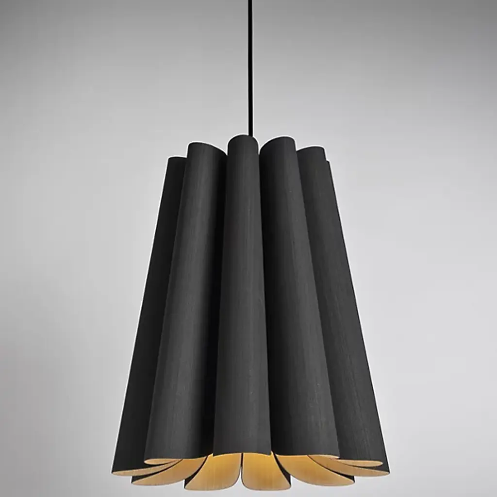 Modern lighting inspired by the beauty of natural landscapes, the Olivia Pendant by Bruck Lighting was designed as part of the Wood Ecological Project (WEP). Its fluid curves and fabric-like drape are achieved through several bent panels of Reconstructed Wood Veneer. The natural grain of the wood is beautifully enhanced by a translucent finish. Hang this pendant over a smaller breakfast table, or install a few in a row to add a warm glow and natural elegance above a long dining table or kitchen island.