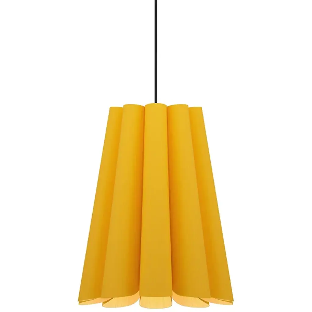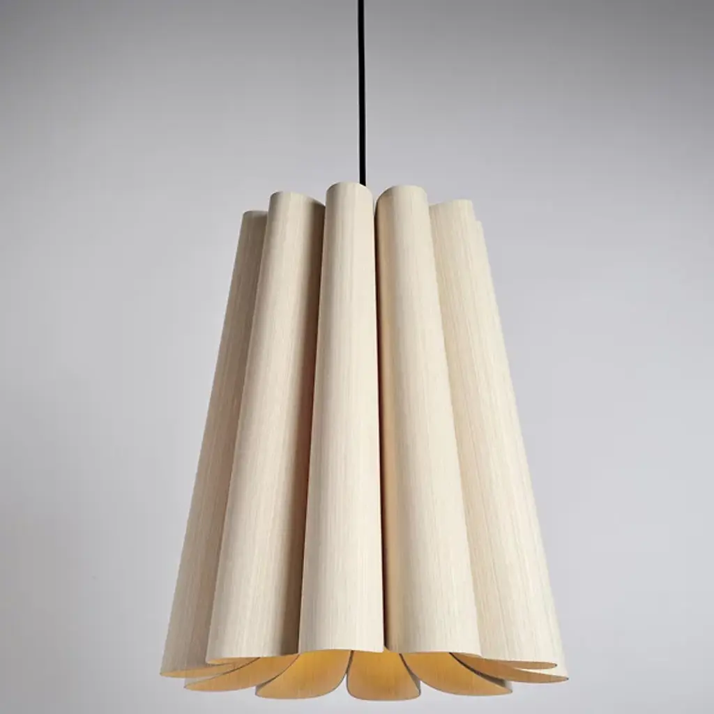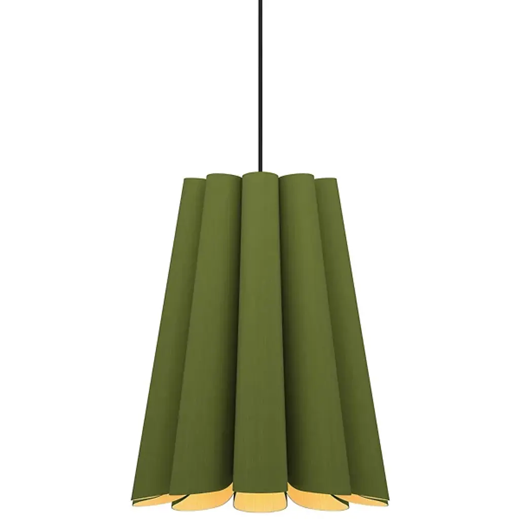 Modern lighting inspired by the beauty of natural landscapes, the Olivia Pendant by Bruck Lighting was designed as part of the Wood Ecological Project (WEP). Its fluid curves and fabric-like drape are achieved through several bent panels of Reconstructed Wood Veneer. The natural grain of the wood is beautifully enhanced by a translucent finish. Hang this pendant over a smaller breakfast table, or install a few in a row to add a warm glow and natural elegance above a long dining table or kitchen island.