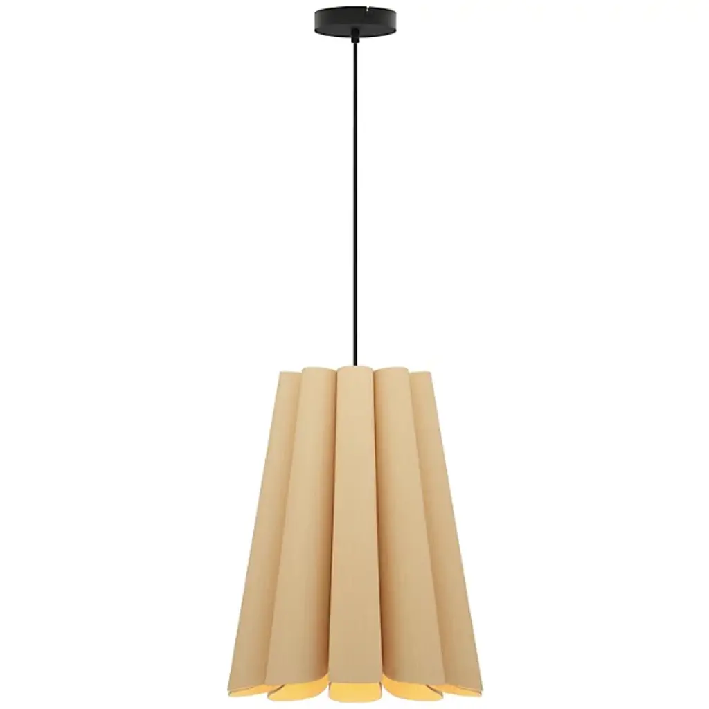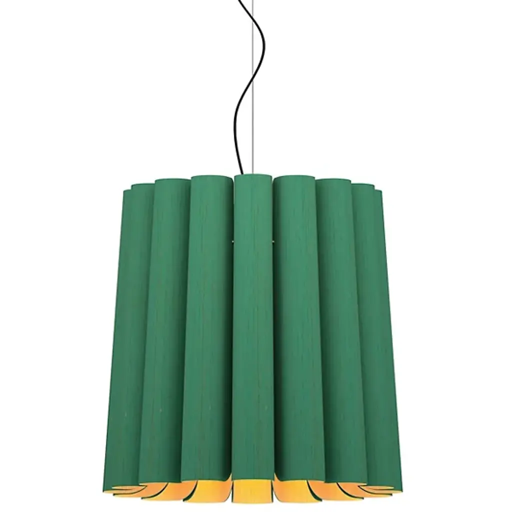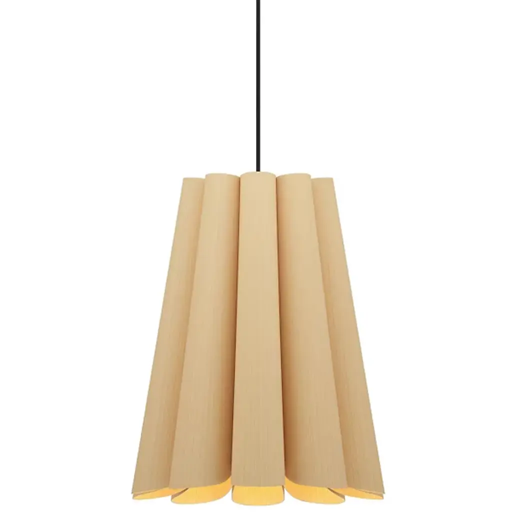 Modern lighting inspired by the beauty of natural landscapes, the Olivia Pendant by Bruck Lighting was designed as part of the Wood Ecological Project (WEP). Its fluid curves and fabric-like drape are achieved through several bent panels of Reconstructed Wood Veneer. The natural grain of the wood is beautifully enhanced by a translucent finish. Hang this pendant over a smaller breakfast table, or install a few in a row to add a warm glow and natural elegance above a long dining table or kitchen island.