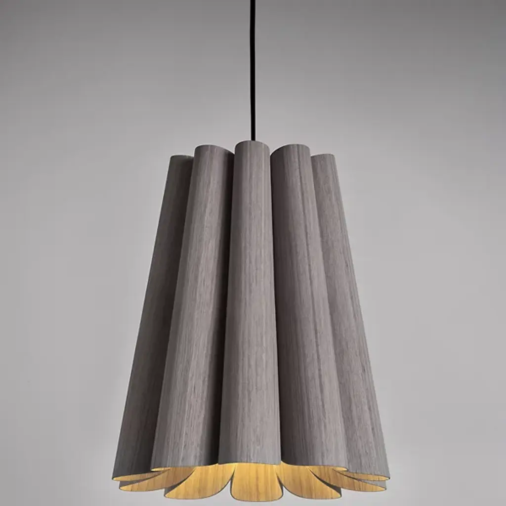 Modern lighting inspired by the beauty of natural landscapes, the Olivia Pendant by Bruck Lighting was designed as part of the Wood Ecological Project (WEP). Its fluid curves and fabric-like drape are achieved through several bent panels of Reconstructed Wood Veneer. The natural grain of the wood is beautifully enhanced by a translucent finish. Hang this pendant over a smaller breakfast table, or install a few in a row to add a warm glow and natural elegance above a long dining table or kitchen island.