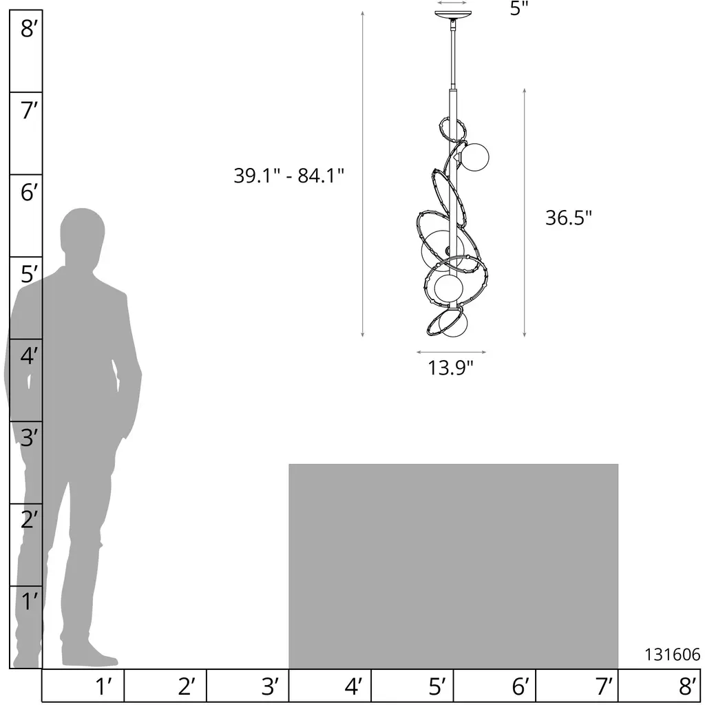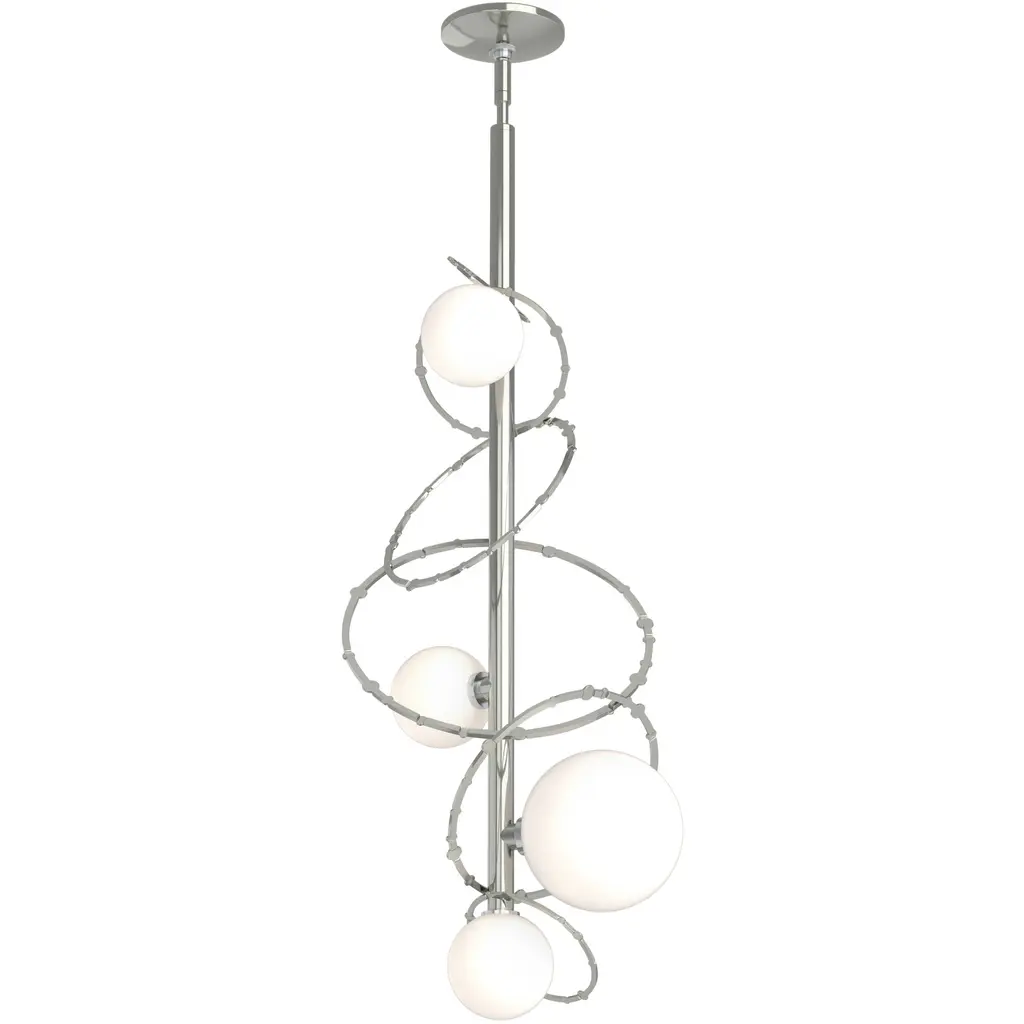 The Olympus Vertical Pendant is part of the 2021 Olympus Collection that includes a grand Orb pendant, wall sconce, two starburst pendants, and a vertical pendant, in addition to this Vertical Pendant. Featuring four glass globes and hand-forged steel rings on a vertical rod, the Olympus Vertical Pendant may be hung singly over a nightstand or vanity, or in multiples over a kitchen island, or any space that requires both light and visual movement.