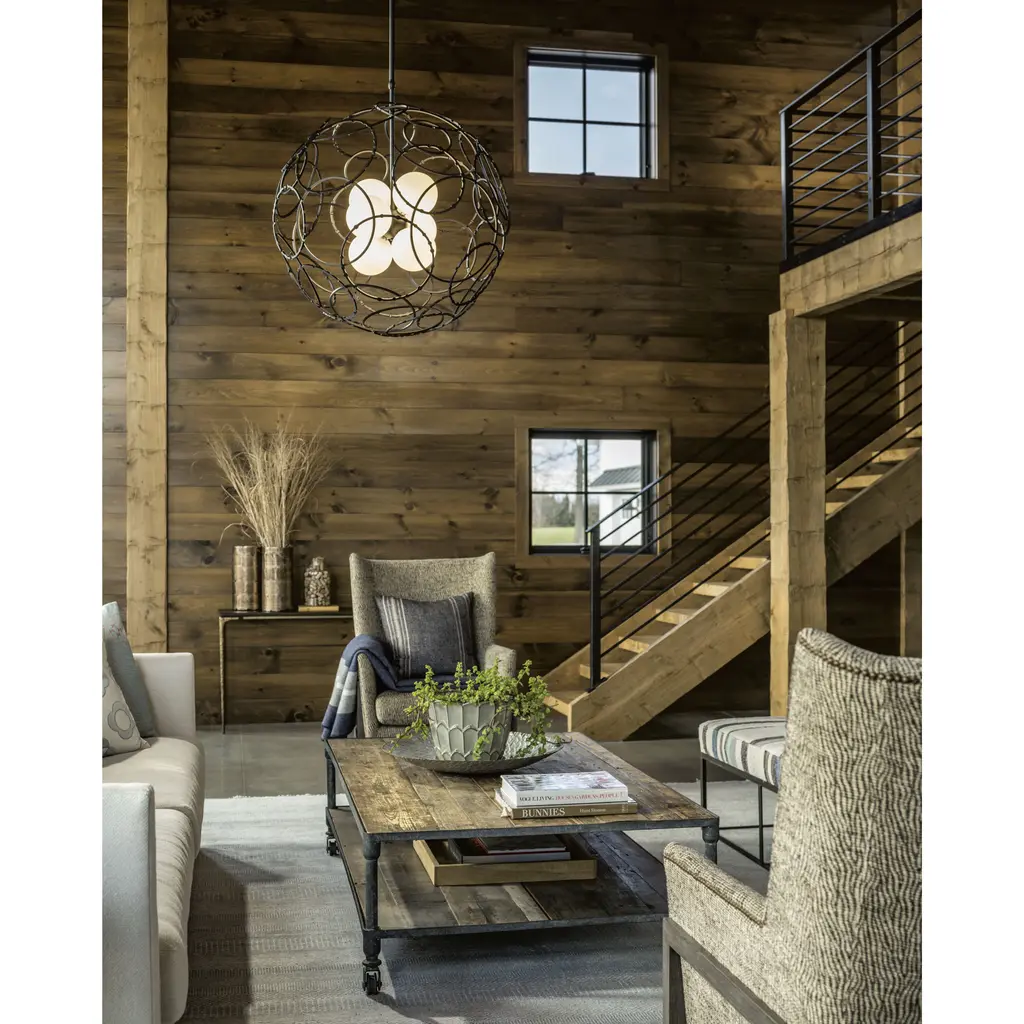 The Olympus Orb Pendant is a real showstopper. Grand in every way, the Orb's exoskeleton is handmade by Vermont metalcraft artisans, with rings of steel creating the outer sphere. A balanced blend of smooth and forged rings, each forged ring is formed and then hammered to create the unique textures and patterns found throughout. Each ring is then welded together to form a perfect sphere. A cluster of lights within glass globes are at the core of the Olympus Orb. A focal piece in any space, the Orb is perfectly suited for great rooms, grand foyers or living spaces. The Olympus Collection includes the Orb, horizontal and vertical pendants, wall sconce, and two sizes of starburst pendants.