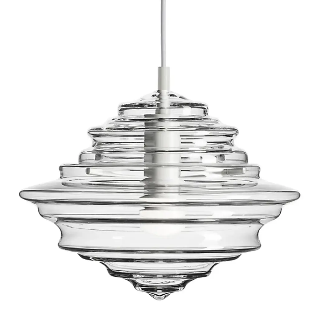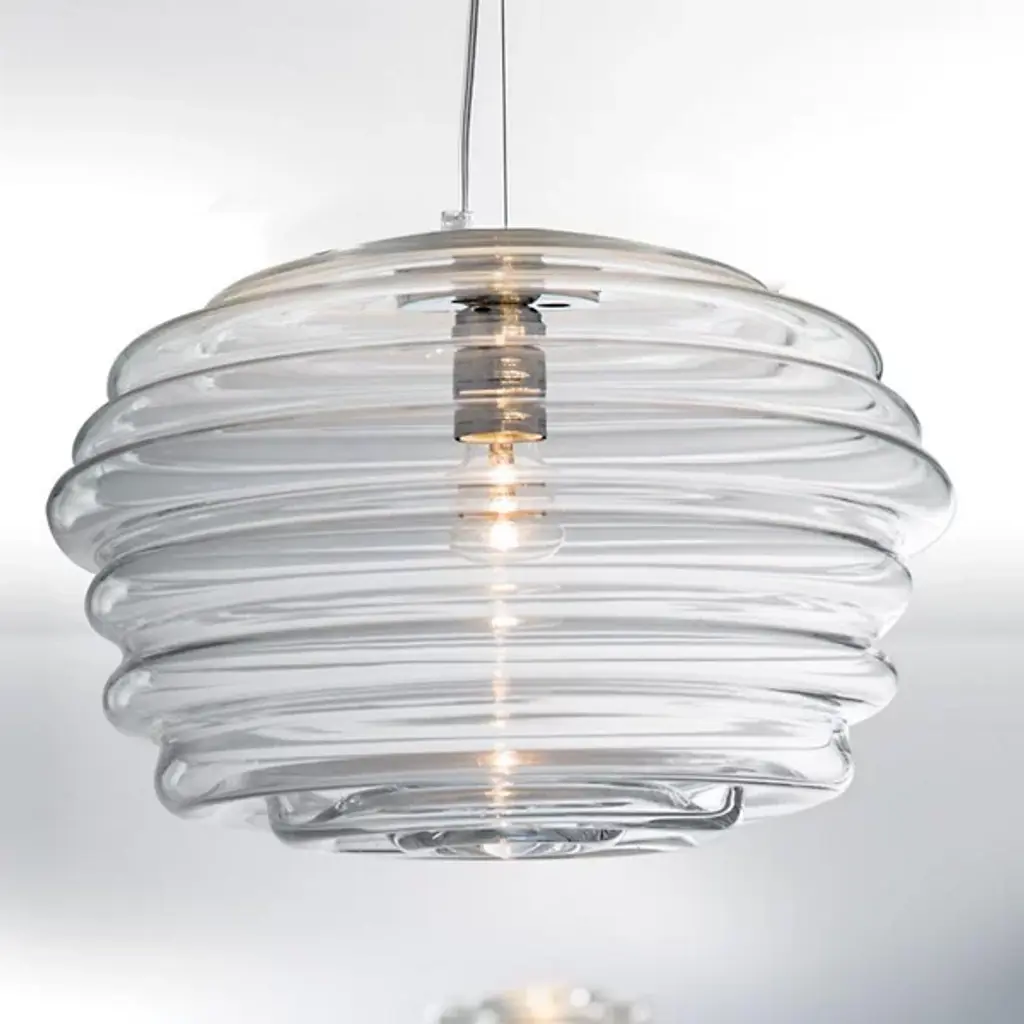 The Onda Pendant by Mazzega 1946 was designed by Giovanni Barbato and brings a flowing, sculptural feel to the spaces it brightens. This pendant was inspired after throwing a rock into a lake and watching the equidistant waves and circles expand. Playing with volume and light, the handworked glass shade featured in this piece is given a characteristic look thanks to horizontal ripples that produce a soft, textured effect as the glass underneath varies in thickness, creating a lovely space for light to filter through.