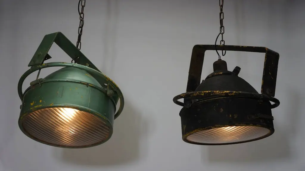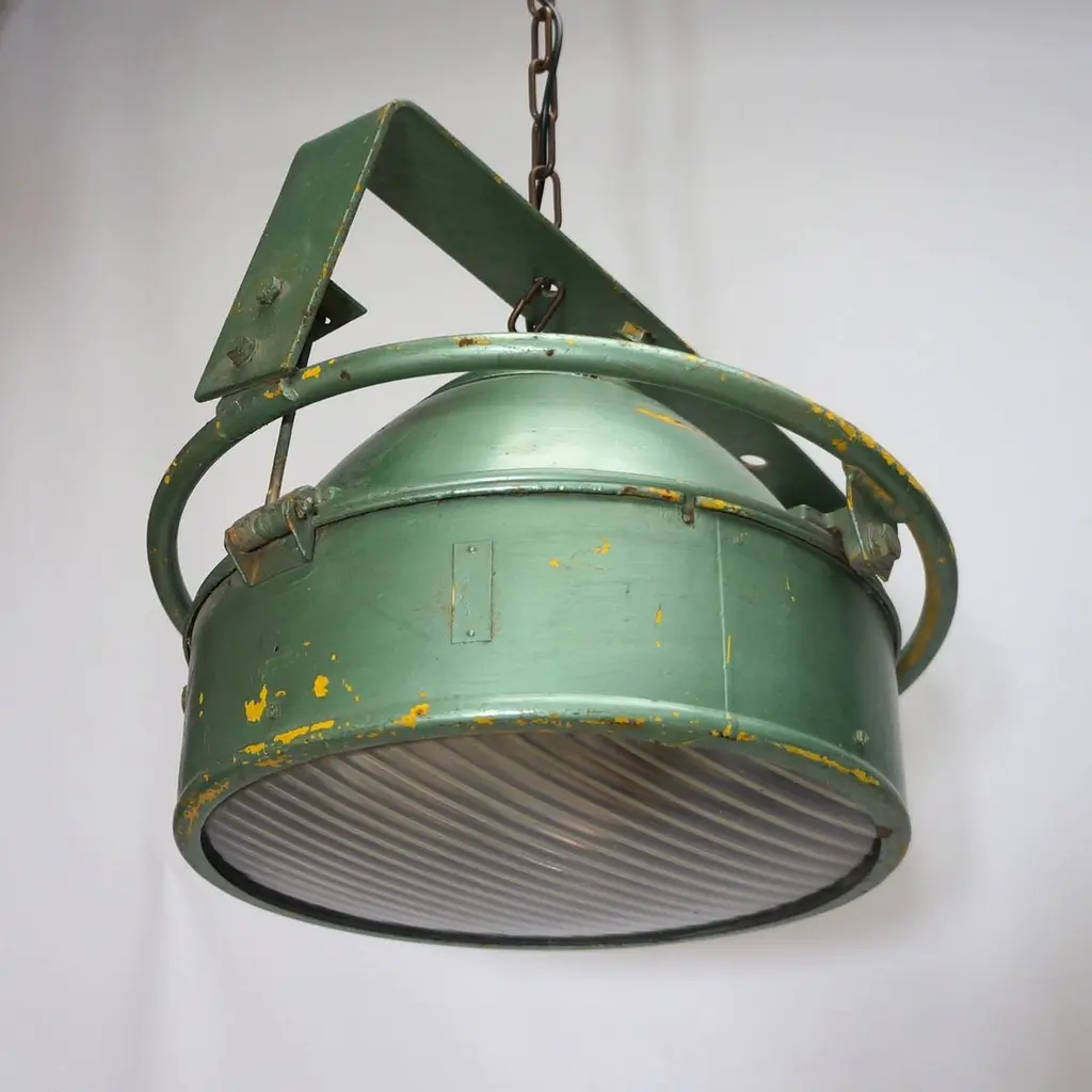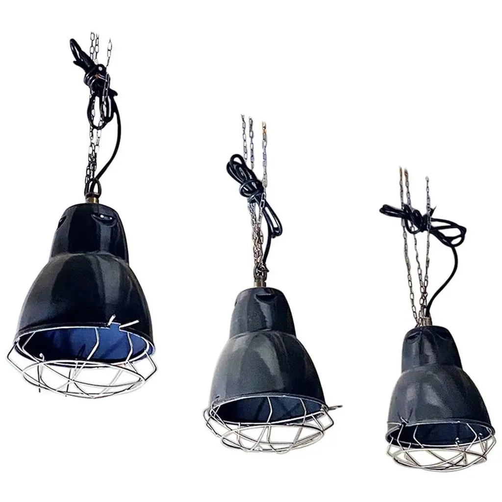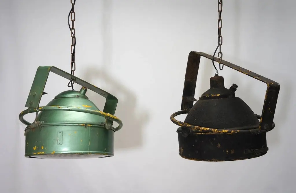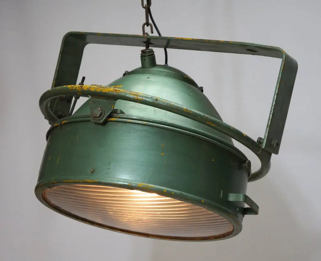 Two beautiful black and green Industrial pendant lights in glass and metal.