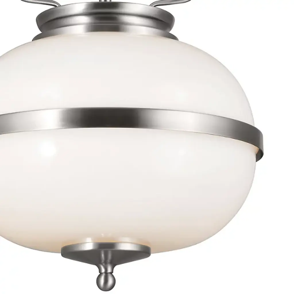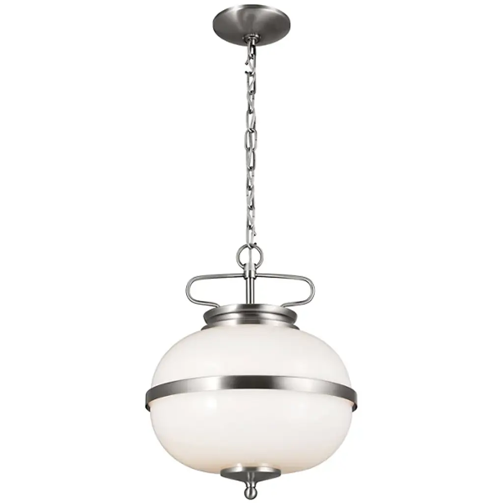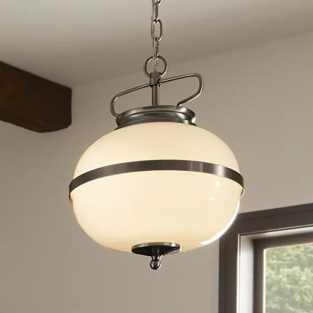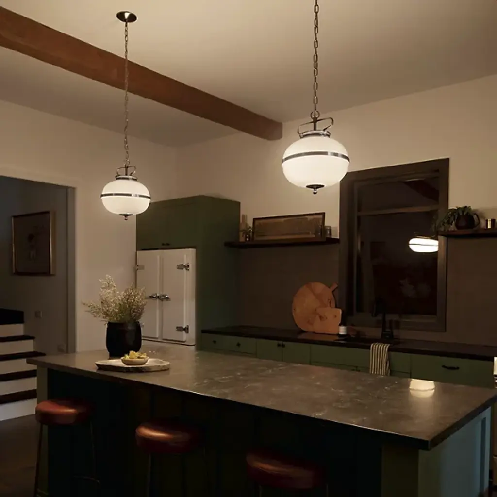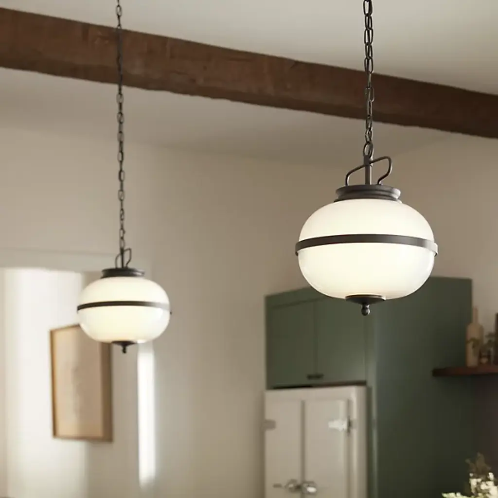 Bring an aura of sophistication to your decorative arrangement with the Opal Pendant by Kichler. A lovely globe-shaped shade suspends from a chain attached to a canopy at your ceiling. Within this shade rests halogen bulbs which readily illuminate your home. The steel band encircling this shade completes the Opal Pendant’s inventive design. You can pair this light with a standard dimmer and adjust the brightness level of the light produced according to your needs.