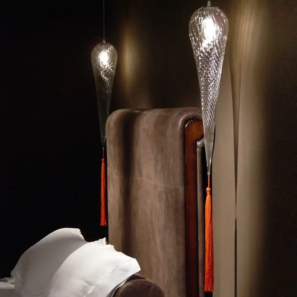 A humble statement of style, inspired by turn-of-the-century aesthetics. Surprise guests with the artful yet familiar silhouette of the Opera Ninive Mini Pendant Light from Melogranoblu. It’s a piece conceived by Melogranoblu to deliver the maximum luminous effect. The piece seduces as a soft tapering form. The one-of-a-kind glass shade is hand-blown by master artisans in Italy. The eyes get lost in the stripes scanning across its surface. The stripes appear like a garment pattern as light from inside seeps through their crevices. The light funnels through and radiates out the glass as an inviting ambient glow. For an elegant throwback, a slim tassel hangs at the end, adding a punch of color and soft thread texture.