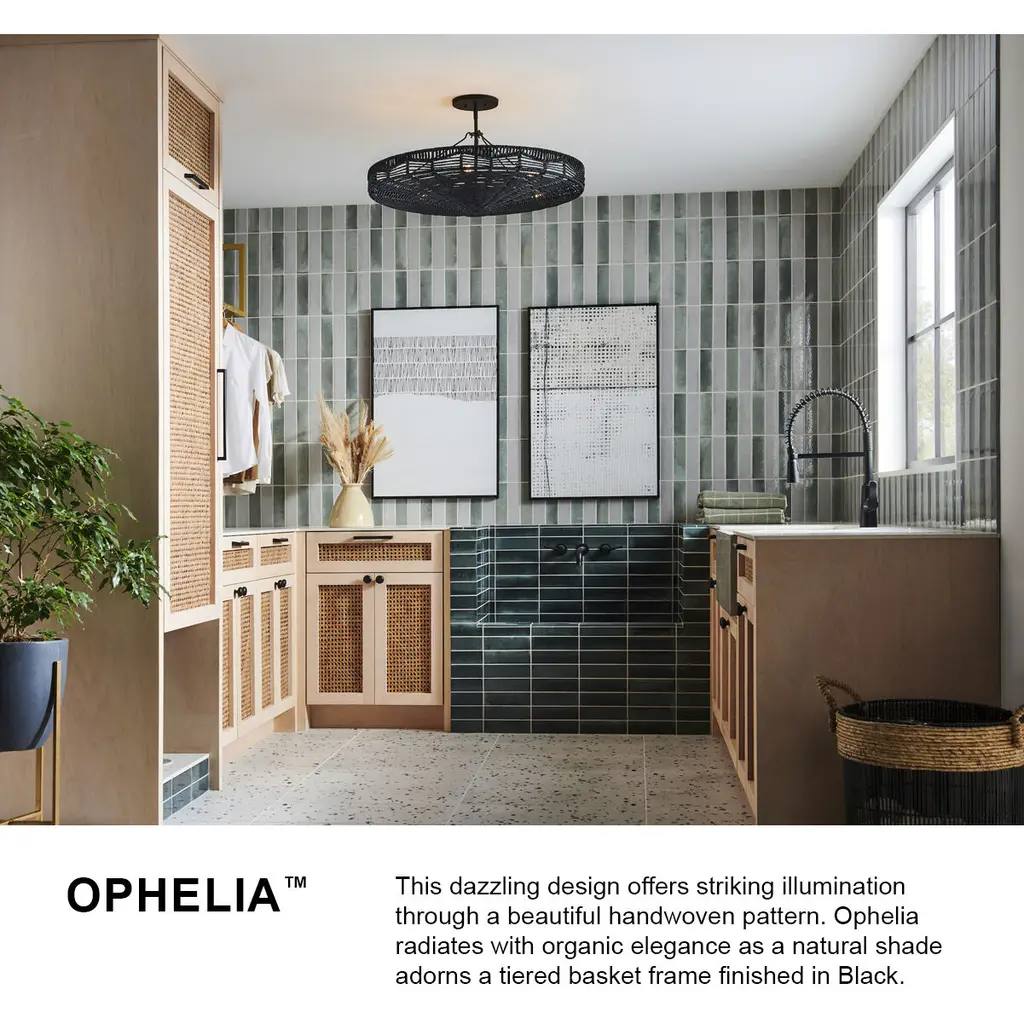 This dazzling design offers striking illumination through a beautiful handwoven pattern. Ophelia radiates with organic elegance as a natural shade adorns a tiered basket frame finished in Black.