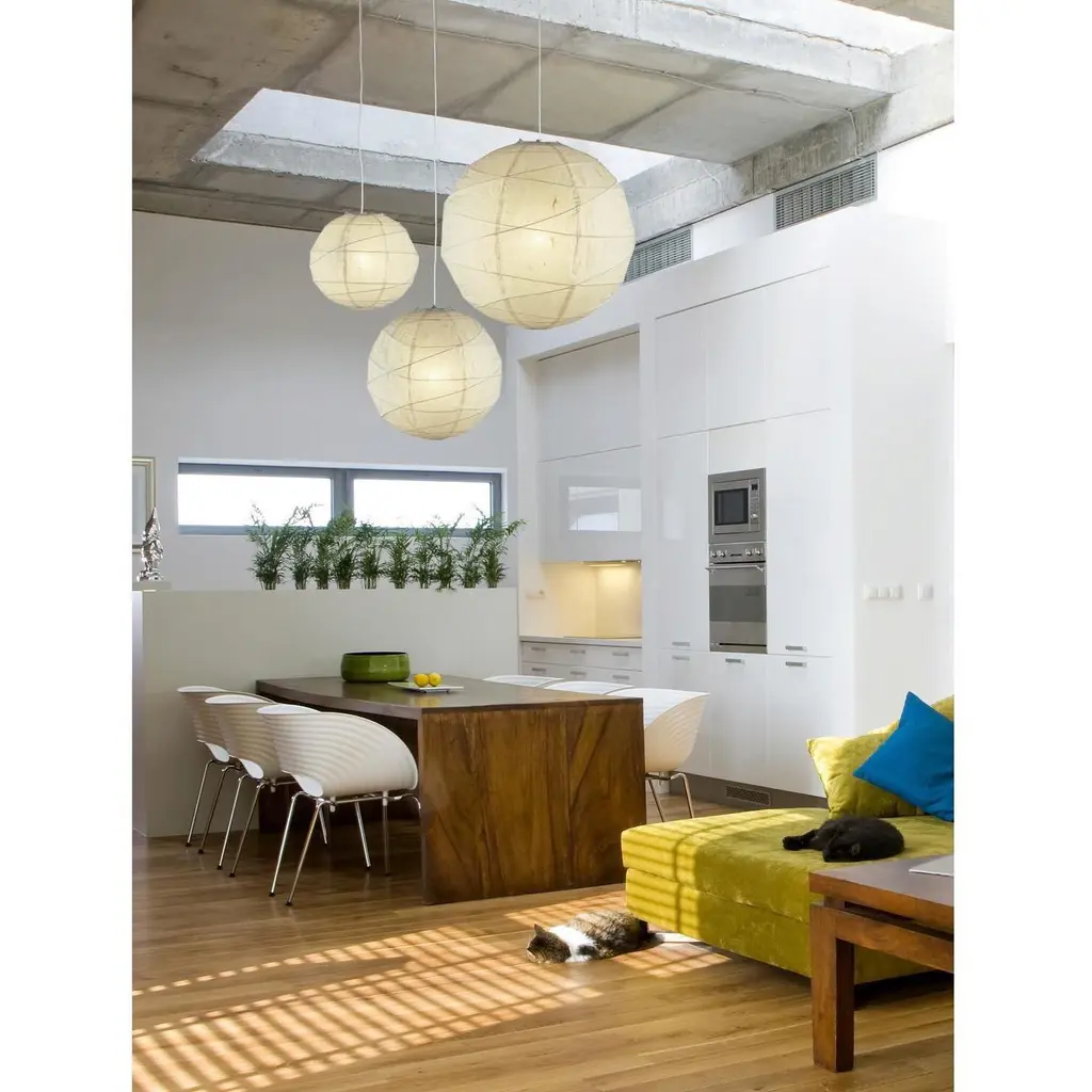 Natural round rice paper collapsible shades with uneven bamboo ribs. 15" cord with socket and hanging apparatus included. Line switch. 100 Watt incandescent or 26 Watt CFL bulb. 24" Diameter.