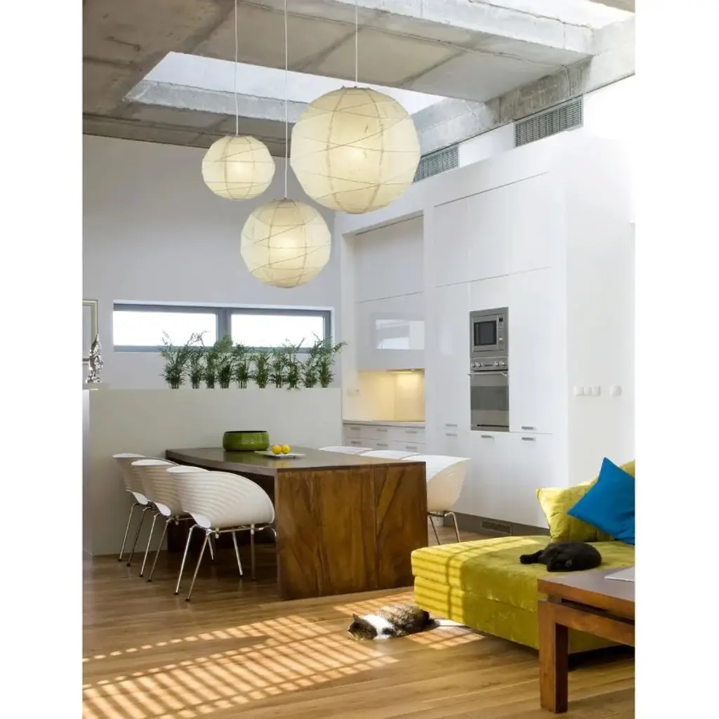 Illuminate any space in your home with the Orb Pendant. Its collapsible rice paper shade features bamboo ribs, combining style and functionality. The sphere comes with a 15-foot cord with a line switch plus the socket and apparatus for hanging. This lamp is smart outlet compatible. Bulb is not included.