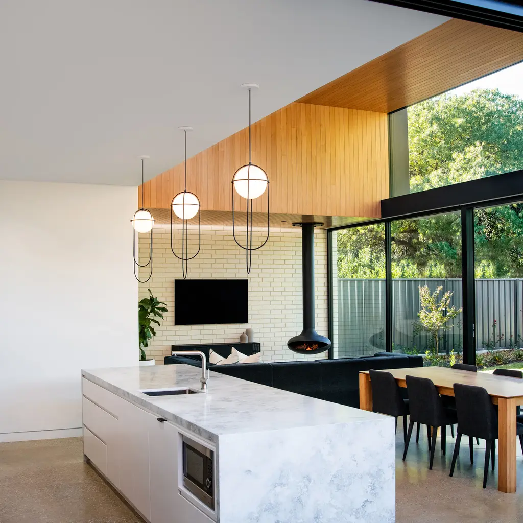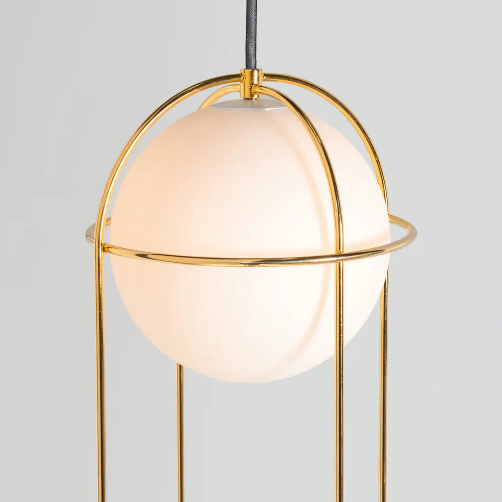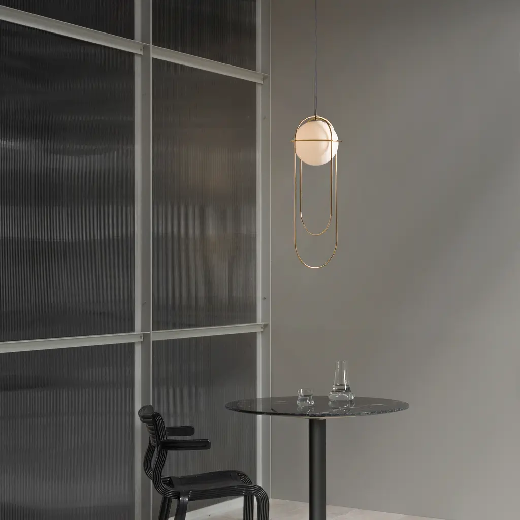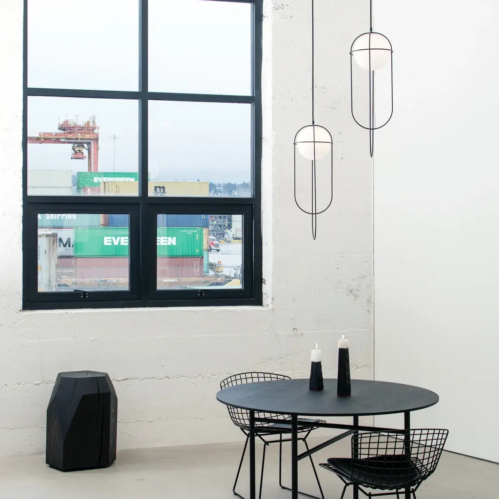Designer Lukas Peet likens a glowing glass globe to nature’s original light source—the sun. “Orbit is a direct response,” he says, “with its metal cage functionally protecting the glass as well as referring back to the sun and our own orbit around it.” With the iconic orb rendered in opalescent glass, the pendant comes with either a black or white encircling framework.