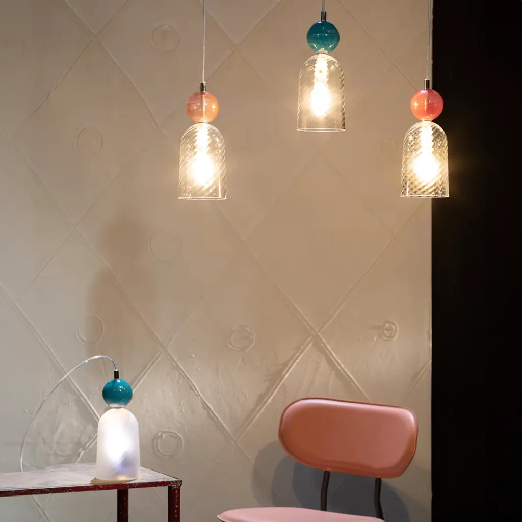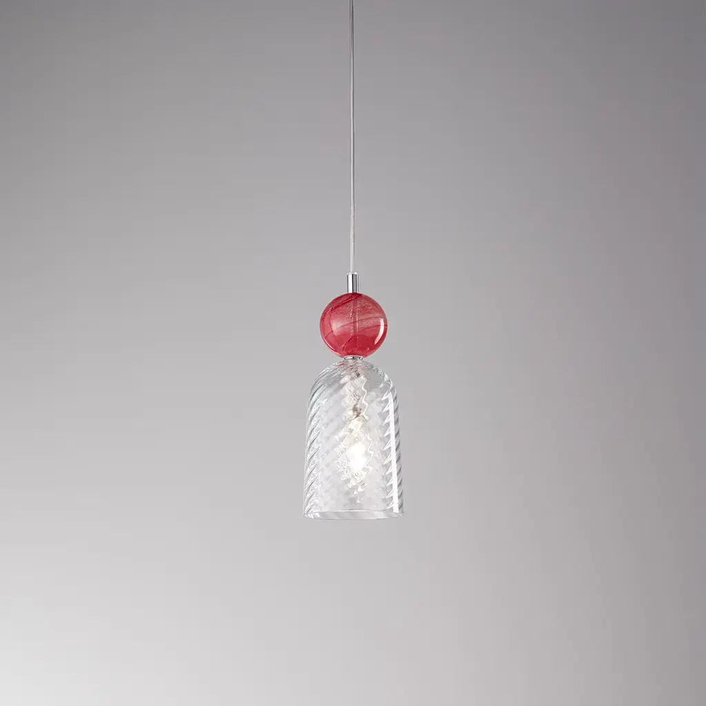 An amber glass globe sitting atop a bell-like diffuser in white Murano glass defines the fresh design of this pendant lamp, an exquisite solution to be arranged with twins in hallways or over kitchen islands. The diffuser is enlivened by a twisted texture, achieved through a minute blowing process carried out directly into the mold, offering dynamism to an otherwise static aesthetic.