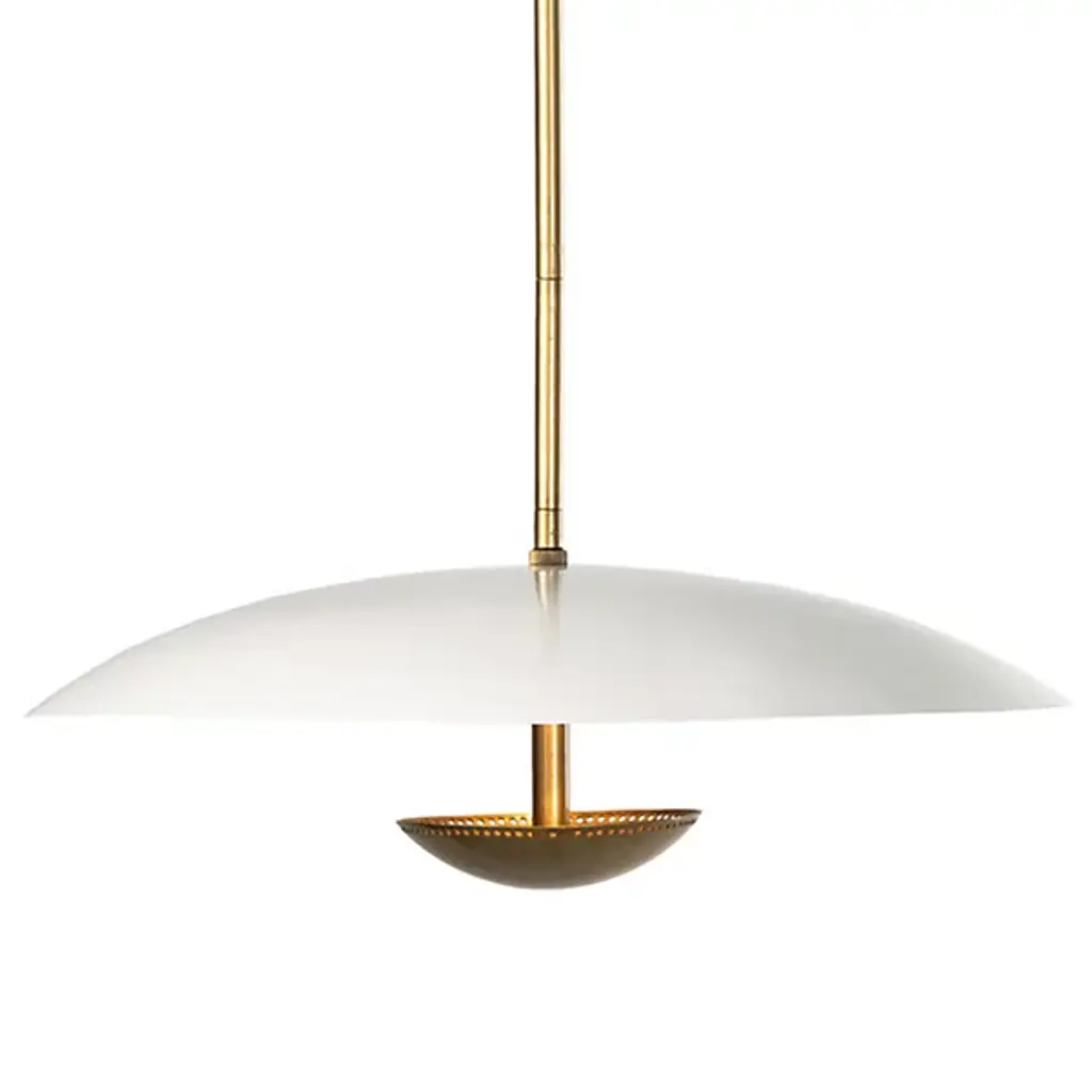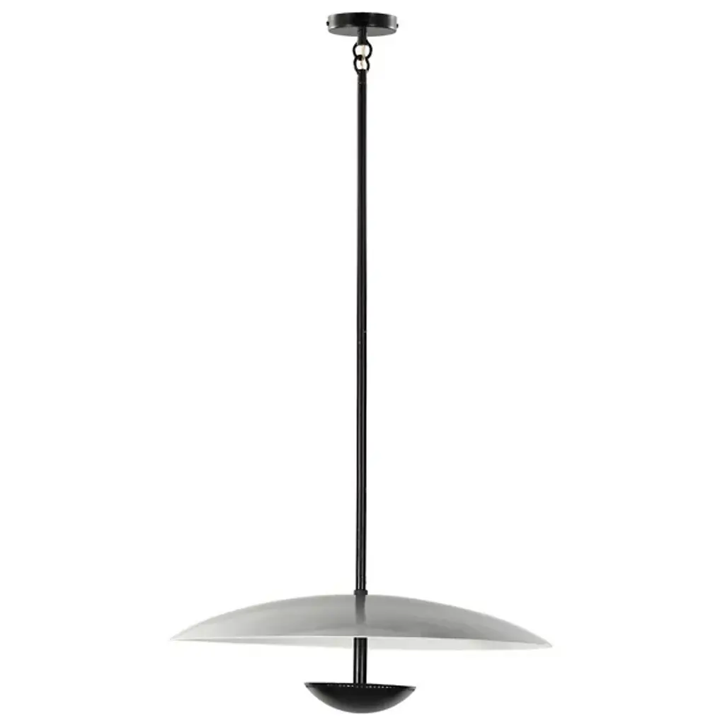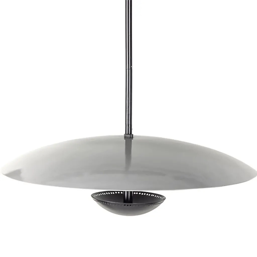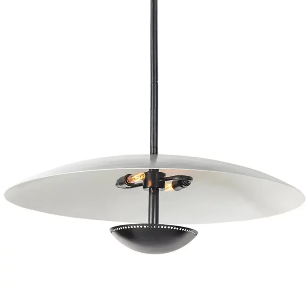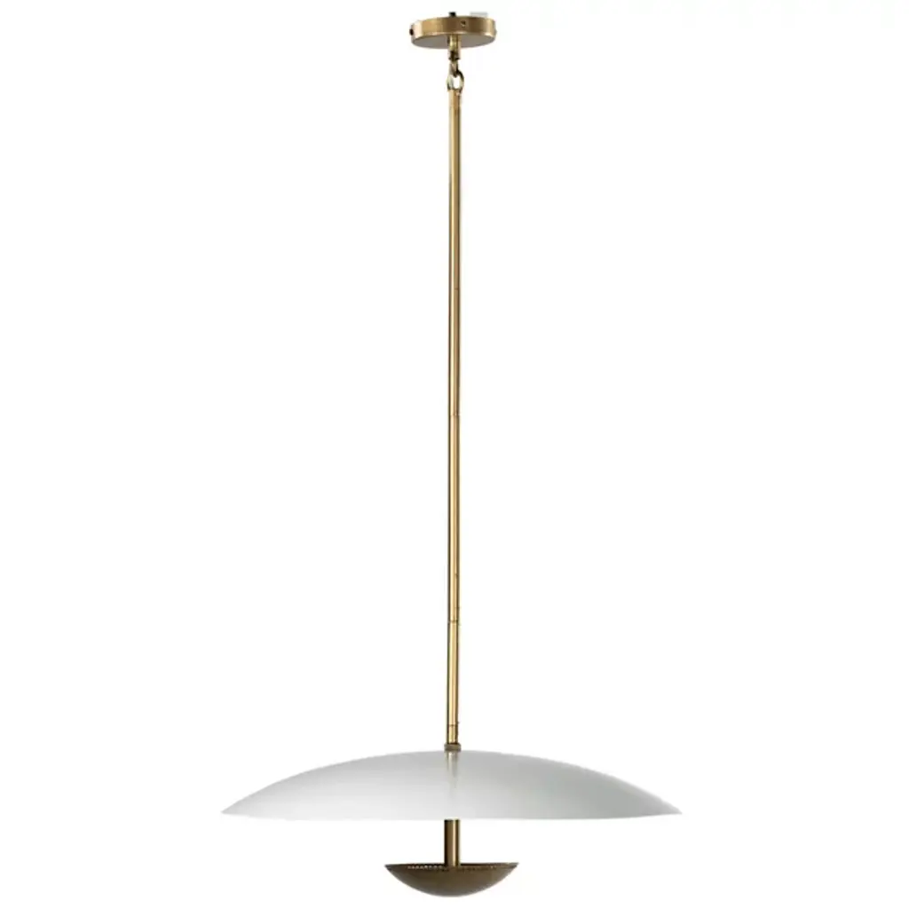 The Oren Pendant from Four Hands adds stately, vintage character to high-ceilinged interior spaces. A circular ceiling mount and single link transmit a slim downrod below, terminating in strong, horizontally-held lamping set inside a shallow dish shade of metal. The fixture is completed by a smaller inverted disc accent, its opaque form enhanced by small vents cut into its rim, dispensing a mix of reflected radiance accented by slightly diffused spots below.