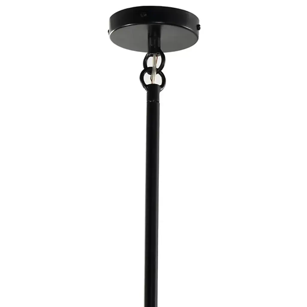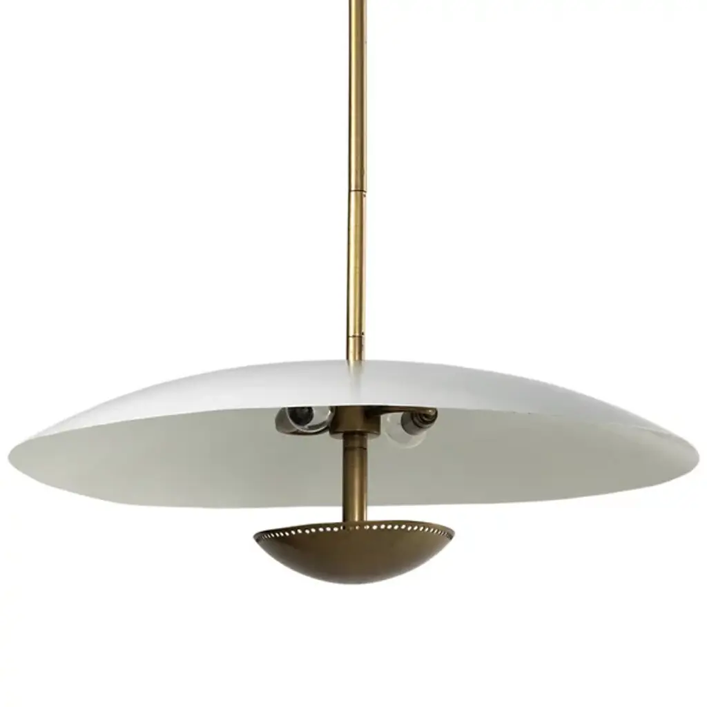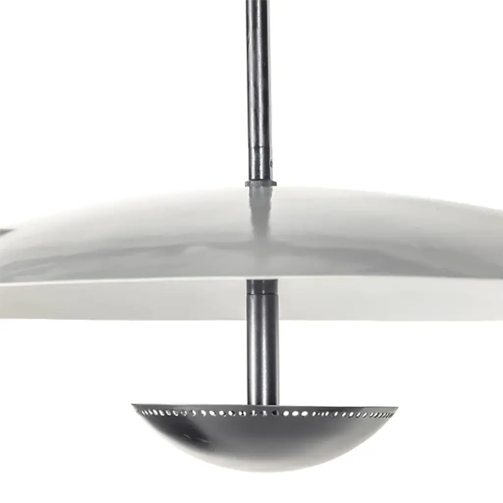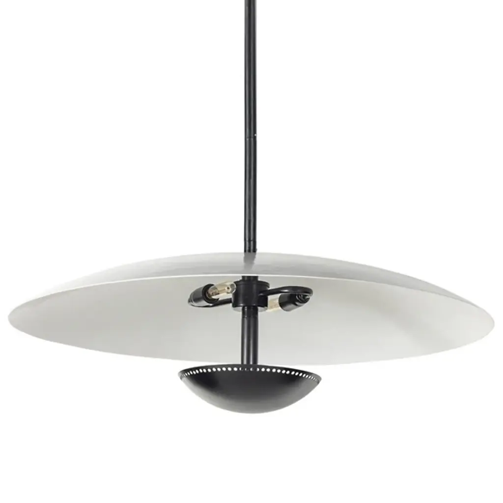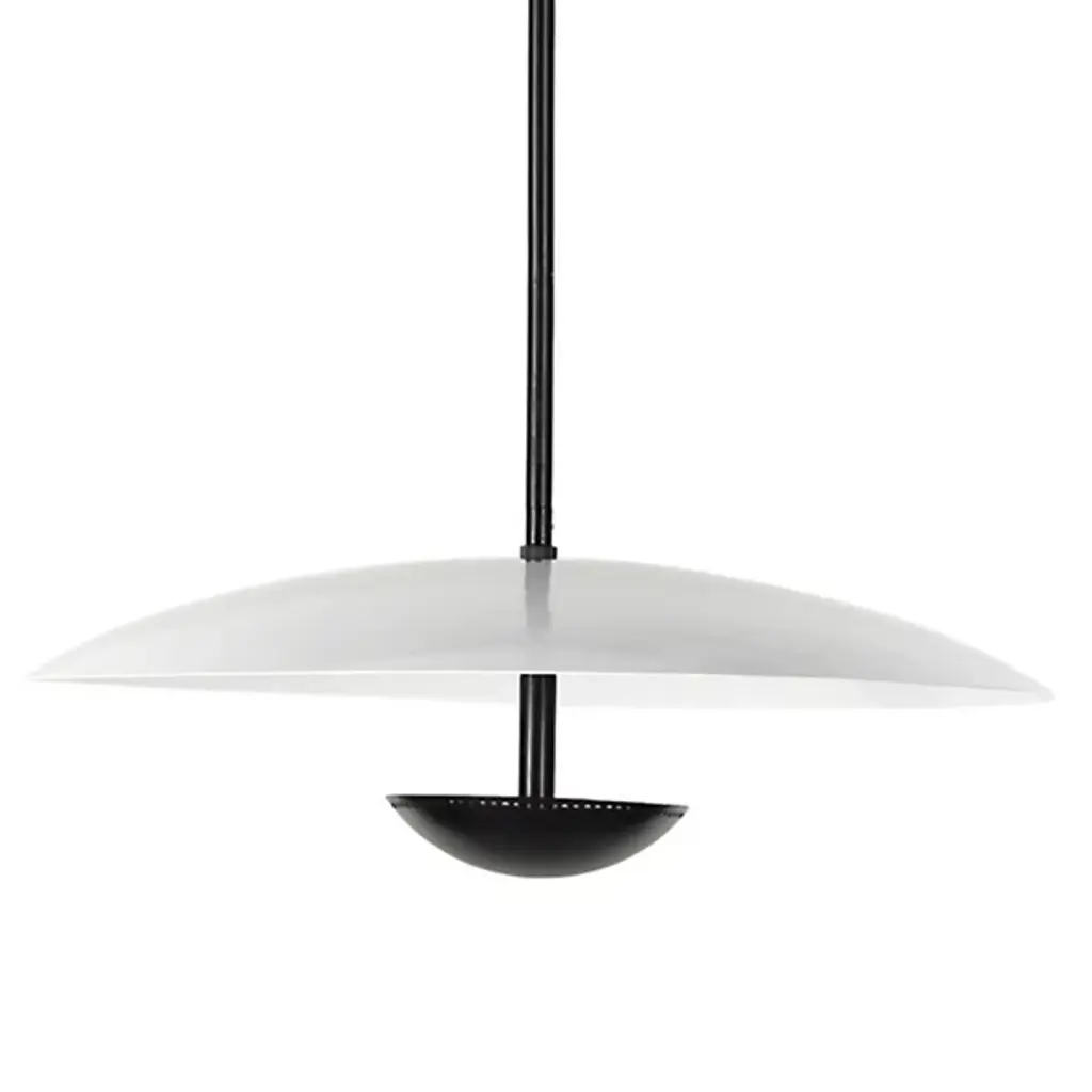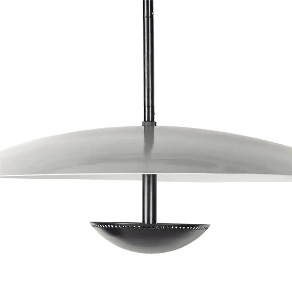 The Oren Pendant from Four Hands adds stately, vintage character to high-ceilinged interior spaces. A circular ceiling mount and single link transmit a slim downrod below, terminating in strong, horizontally-held lamping set inside a shallow dish shade of metal. The fixture is completed by a smaller inverted disc accent, its opaque form enhanced by small vents cut into its rim, dispensing a mix of reflected radiance accented by slightly diffused spots below.