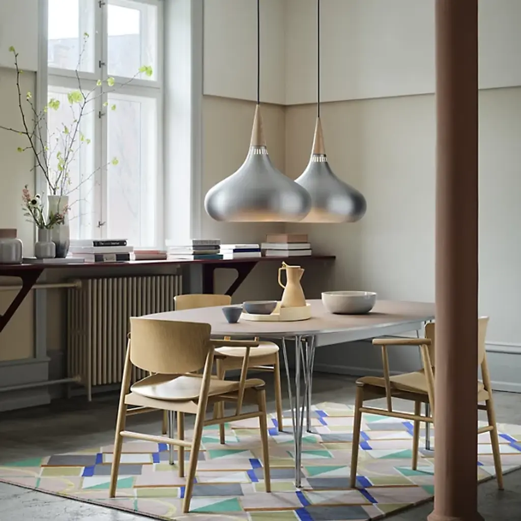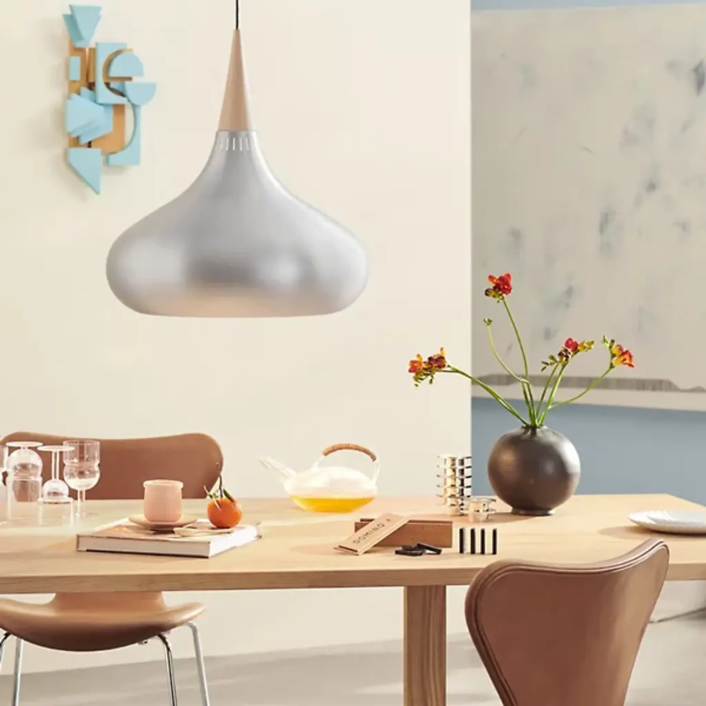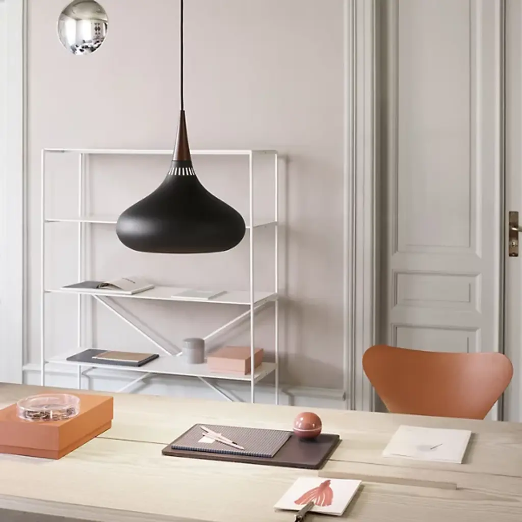 The Orient Pendant from Fritz Hansen was designed by Jo Hammerborg in 1963. Its profile captures a mid-century modern essence, as it features a pointed wooden crown at the top. This fixture is FSC-certified and sourced from responsibly managed forests, reflecting a commitment to sustainability. Plus, its Greenguard Certification reflects adherence to strict low chemical emissions standards. The pendant offers a glare-free experience courtesy of the meticulous contours of its aluminum body.