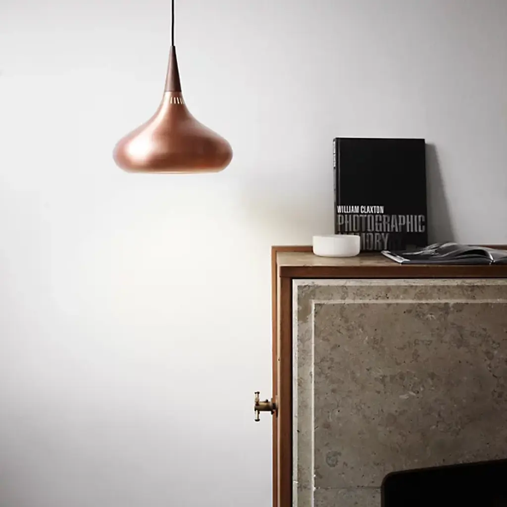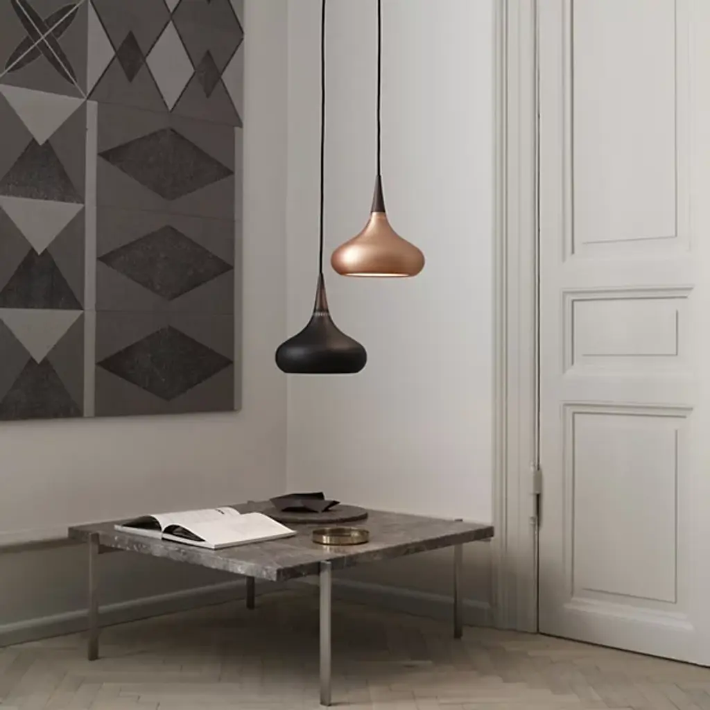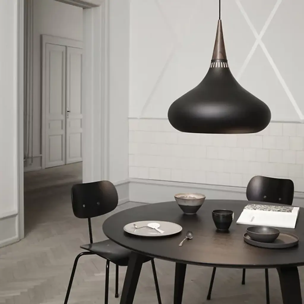 The Orient Pendant from Fritz Hansen was designed by Jo Hammerborg in 1963. Its profile captures a mid-century modern essence, as it features a pointed wooden crown at the top. This fixture is FSC-certified and sourced from responsibly managed forests, reflecting a commitment to sustainability. Plus, its Greenguard Certification reflects adherence to strict low chemical emissions standards. The pendant offers a glare-free experience courtesy of the meticulous contours of its aluminum body.