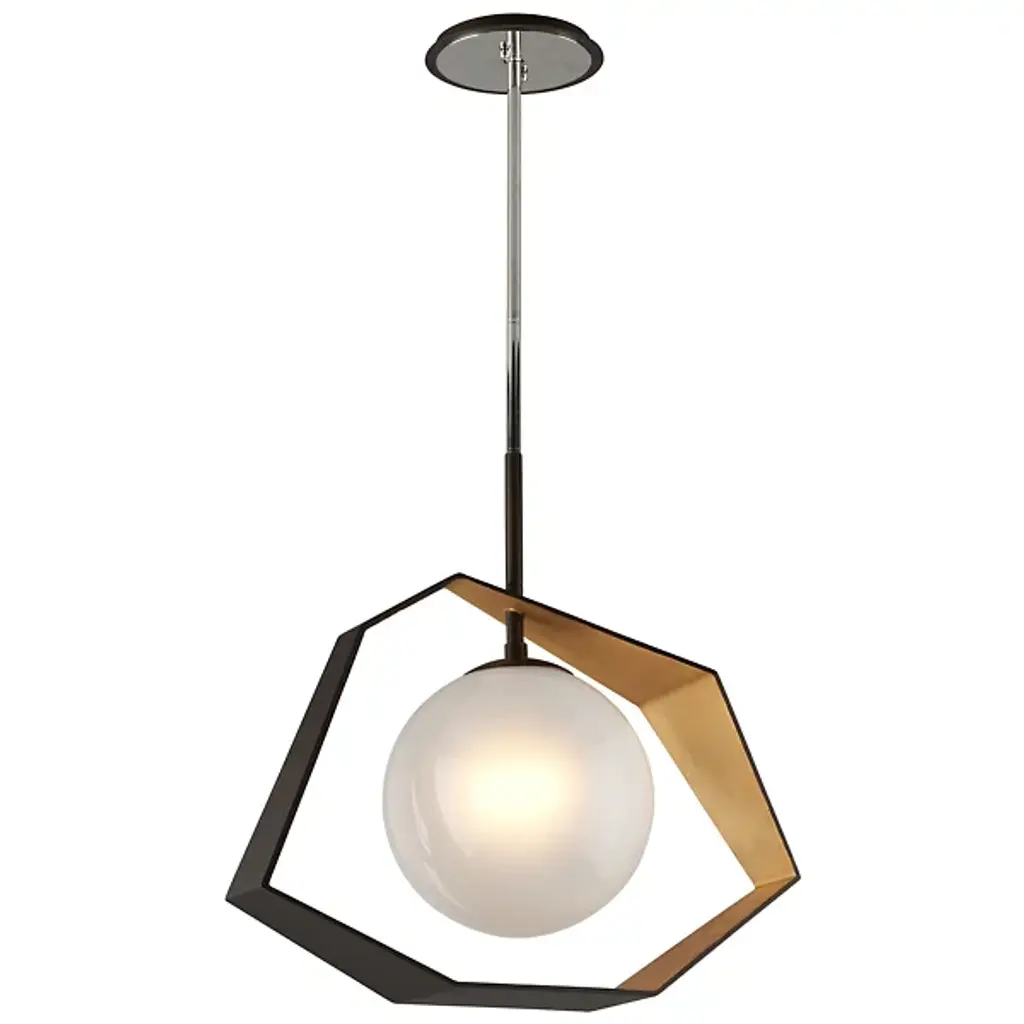 Make a strong decorative statement with the Origami LED Dining Pendant by Troy Lighting. Its dynamic spirit is articulated through an open, Hand-Worked Iron frame with crisp, paper-like folds. This frame surrounds a spherical Frosted Glass shade, providing depth to its seamless shape and reflection for its warm lighting.