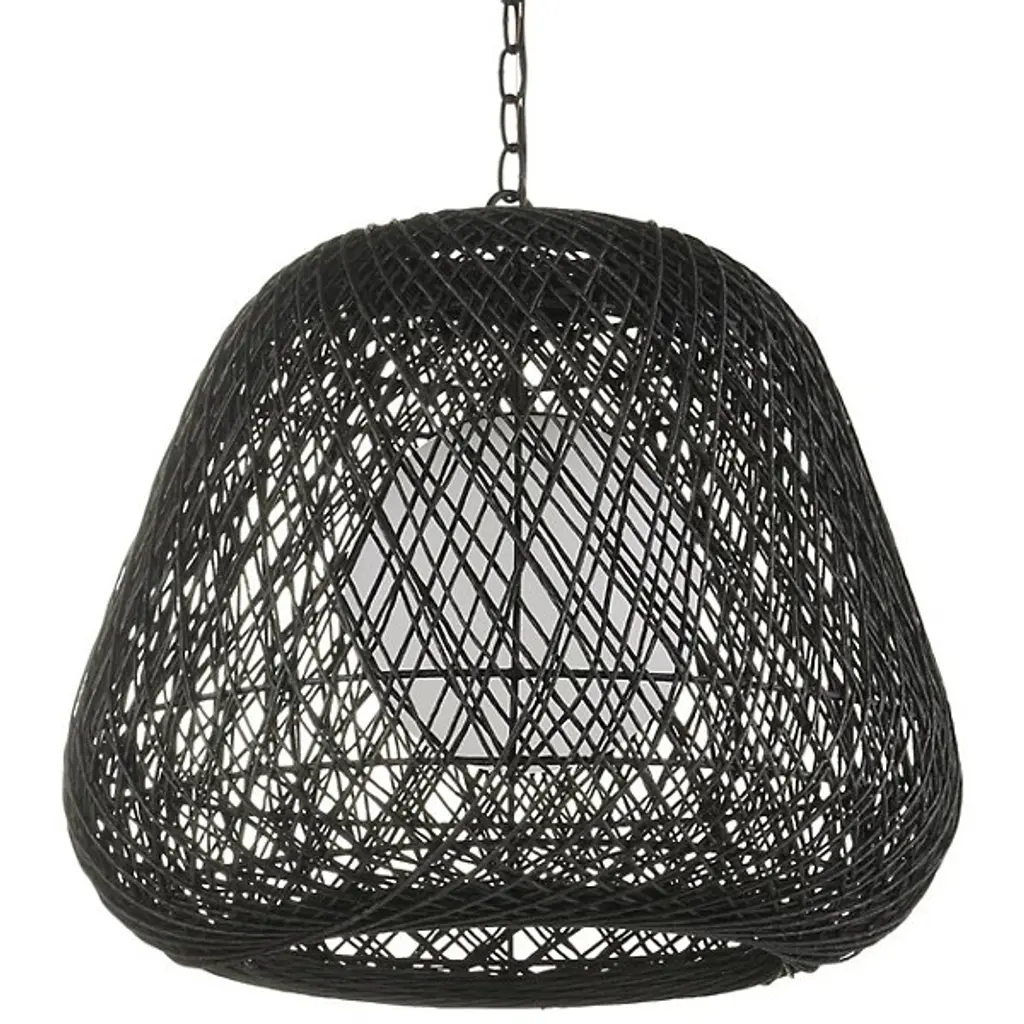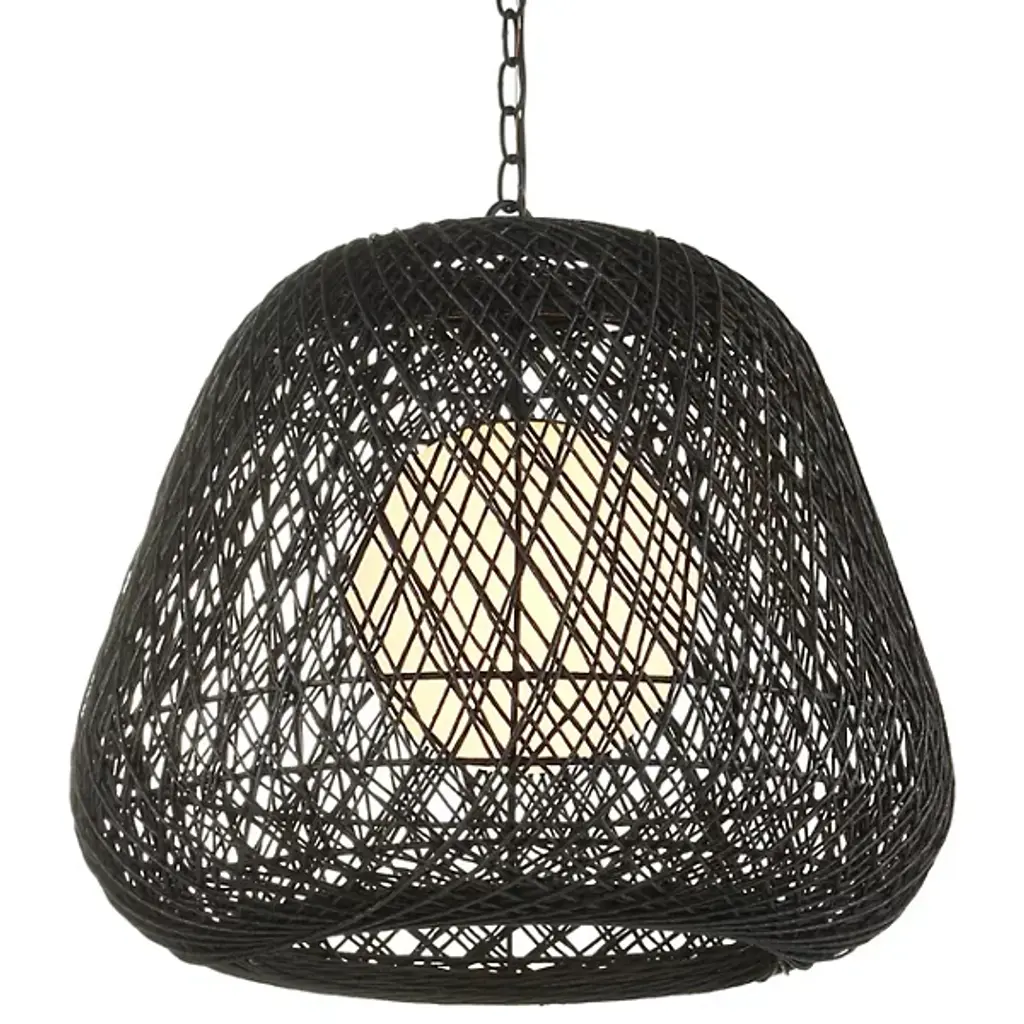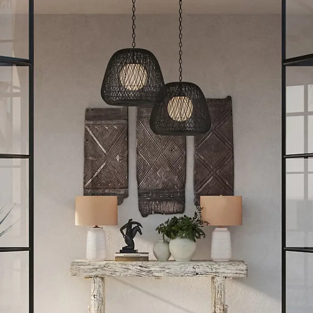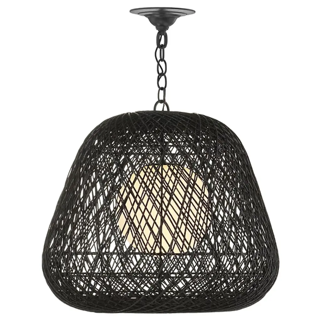 The Osbert Pendant from Currey & Company nestles a glowing glass globe within a cocoon of intricately woven paper twine. Thin metal rings in graduated sizes provide the framework for the artisanal looping pattern. The careful layering of kraft paper creates depth and dimension around the luminous core. The wrought iron structure adds stability while maintaining the pendant's airy quality. Perfect above dining tables or in entryways, this pendant draws the eye upward while providing ambient lighting.