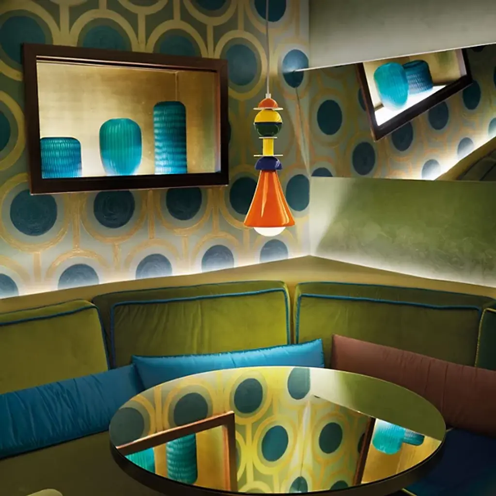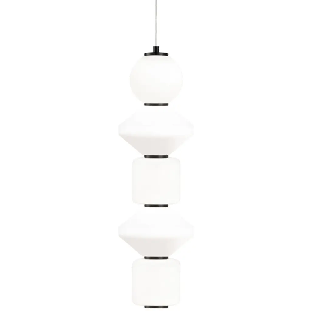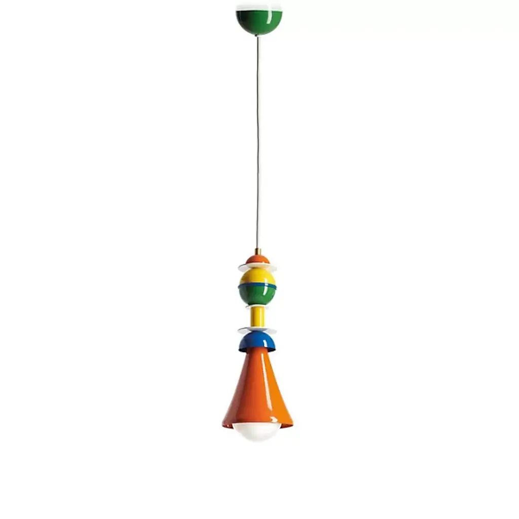 Playful and contemporary. The Otello LED Pendant is a transitionally designed piece of luxury lighting from Slide. It is a creation by Giò Colonna Romano that was made in Italy and features distinctive Memphis design prompts. A whimsical composition of shapes and colors in a lacquered glossy finish makes up the aluminum metalwork. LED capability allows for eco-friendly qualities such as low energy consumption and long burn time. Placement options for the Otello are vast. They could easily display solo over a dining area or be placed in multiples in a living space or entryway for added drama.