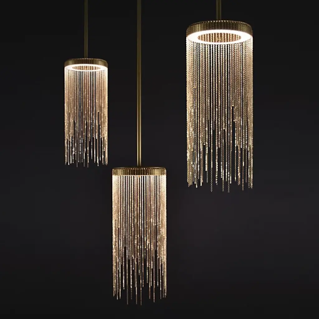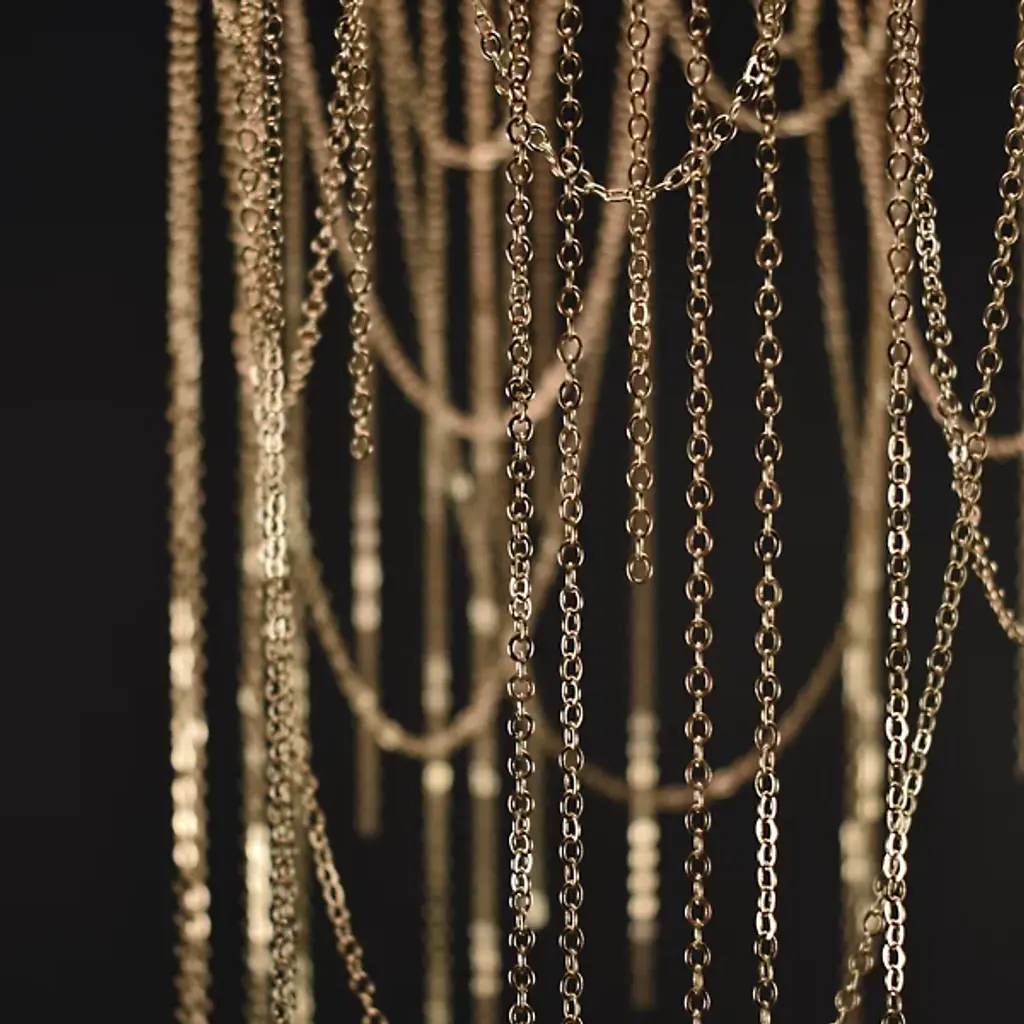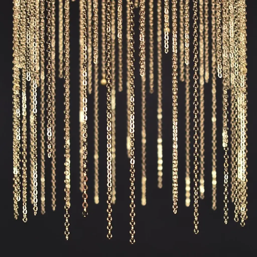 The Otero XS LED Mini Pendant from Larose Guyon provides a graceful and elegant appeal to inside ceilings, taking pride of place as a gorgeous, angelic presence of famed Parisian beauty Caroline Otéro, called La Belle Otéro, known for her exotic and striking style and love of Jewelry. Evoking the famous creations of jewelers Cartier and Boucheron, its expressive beauty transforms its surroundings, suspending simply from a stepped circle canopy via a slim central stem, placing LED lamping inside two copper rings as a light housing, accompanied by a daring drapery of fine chains that drop at different lengths, forming a curtain around it that glows and glitters with warm downlight.